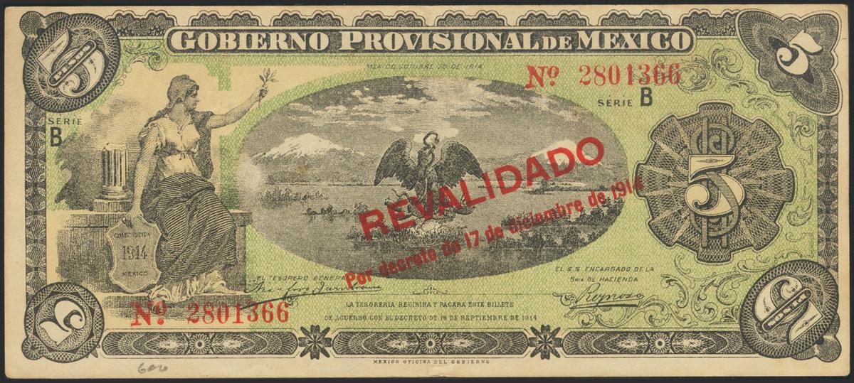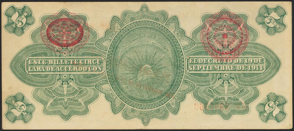 MEXICO. 5 pesos. 1914. Provisional Government of Mexico. (Pick: S702b). About Extremely Fine.