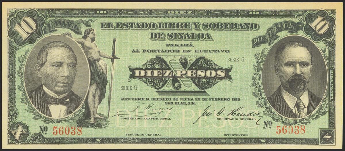 MEXICO. 10 pesos. 1915. The Free and Sovereign State of Sinaloa. (Pick: S1045a). Minimal, partial and almost imperceptible soft fold from mishandling on top margin. Uncirculated.