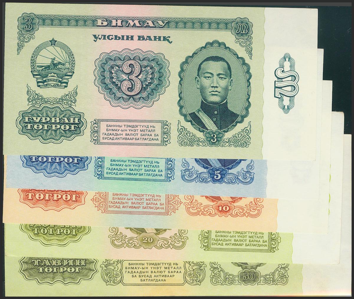 MONGOLIA. Set of 5 banknotes: 3 Tögrög, 5 Tögrög, 10 Tögrög, 20 Tögrög, 50 Tögrög. 1981-1983. (Pick: 43, 44, 45, 46, 47). 47 is a bit dirty on bottom right corner. About Uncirculated to Uncirculated.