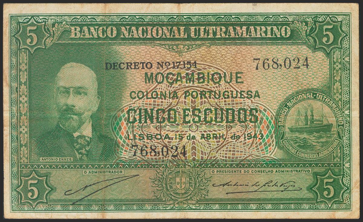 MOZAMBIQUE. 5 Escudos. 1943. (Pick: 89a). About Very Fine.