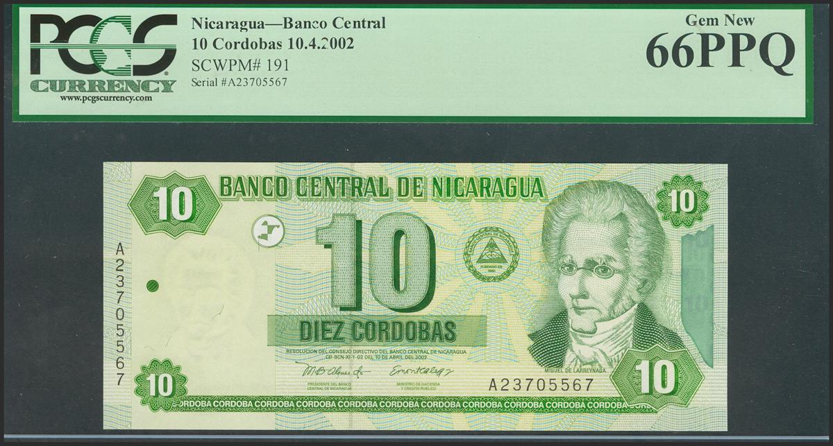 NICARAGUA. 10 Cordobas. 2002. (Pick: 191). PCGS66PPQ.