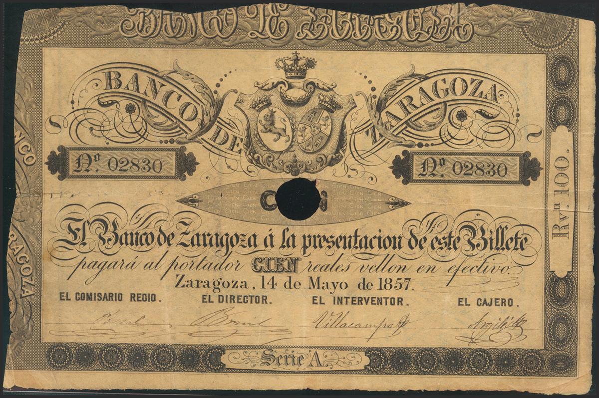 100 Reales. May 14, 1857. Bank of Zaragoza. Series A. With drill and without signatures. (Edifil 2021: 127A). Good Very Fine.