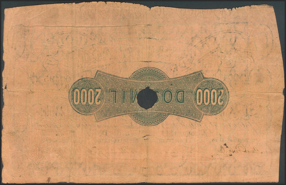 2000 Reales. May 14, 1857. Bank of Zaragoza. Series E. With hole and without signatures. (Edifil 2021: 130A). Rare Good Very Fine.
