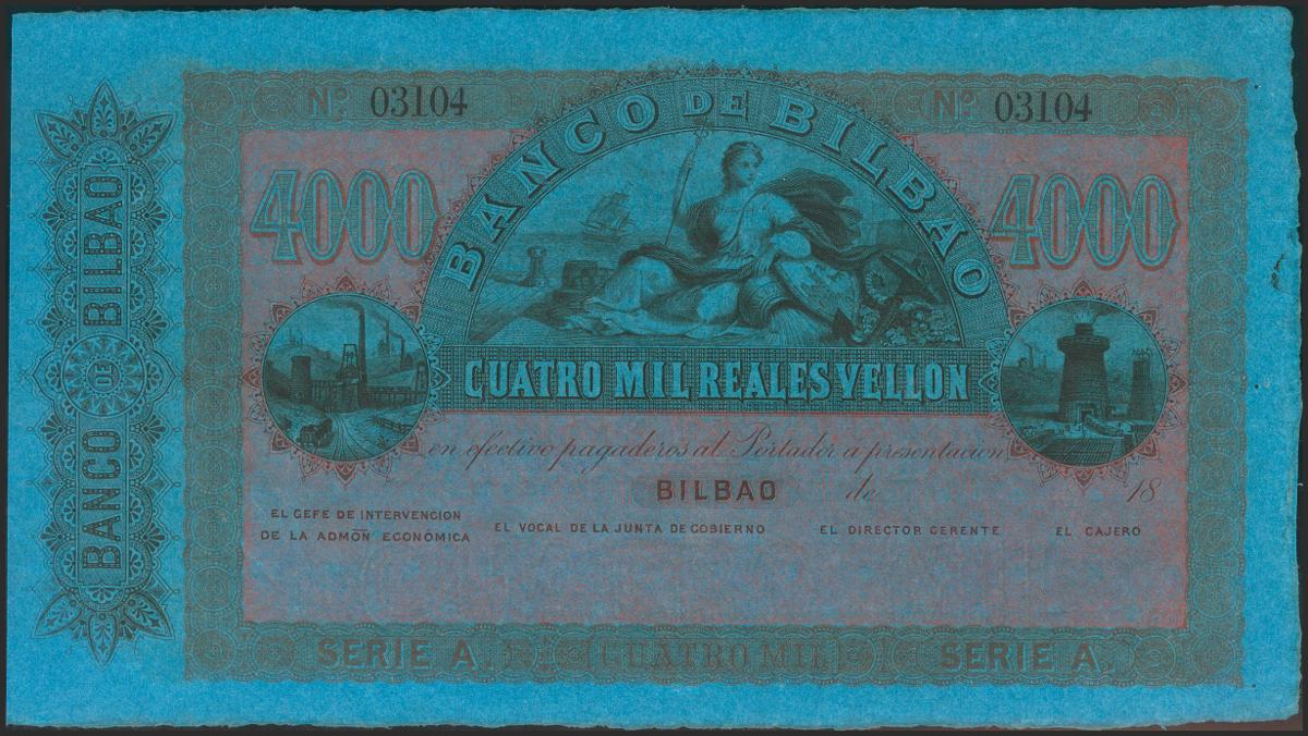 4000 Reales. August 21, 1857. Banco de Bilbao. Series A. Without signatures and with numbering. (Edifil 2021: 148). Almost Uncirculated.