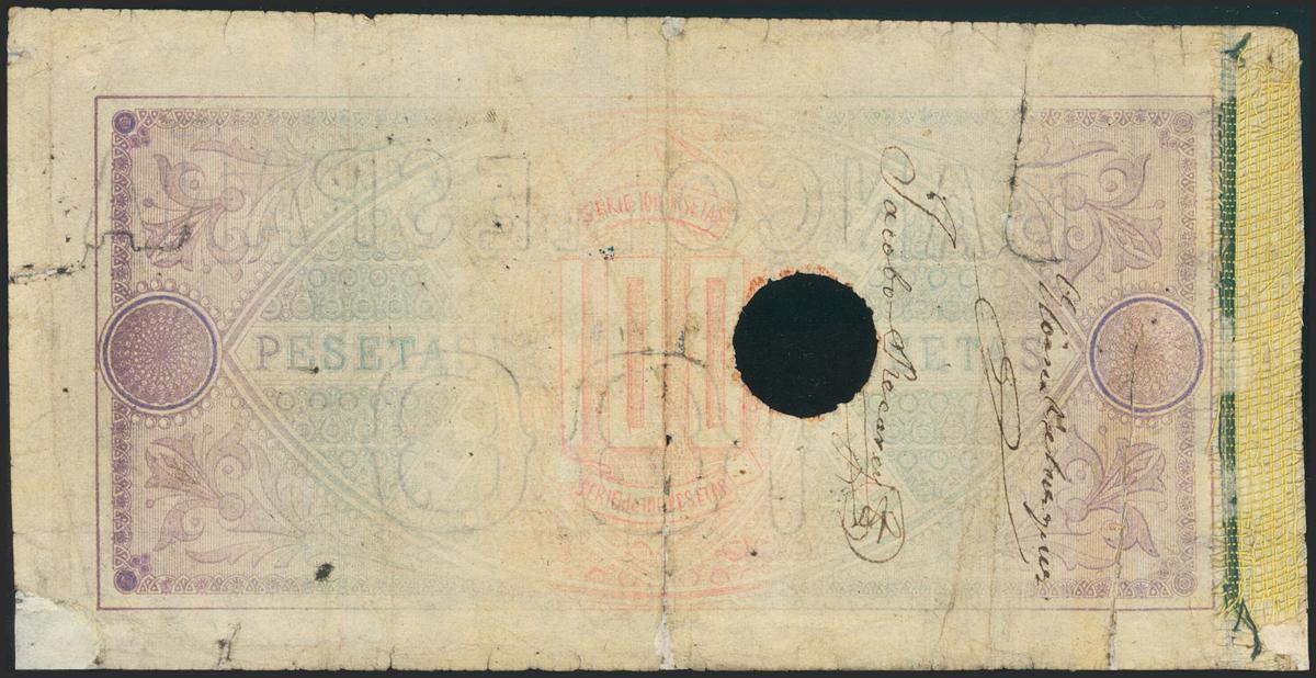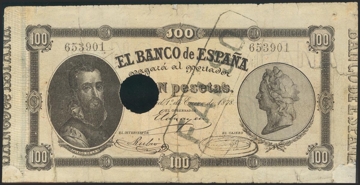 100 pesetas. January 1, 1878. FALSE FROM TIME, mark FALSE on the obverse (this copy was discovered by the administration and signatures on the back. No serial. (Edifil 2021: 273F). Very rare and striking banknote, presents some repair. Very Fine.