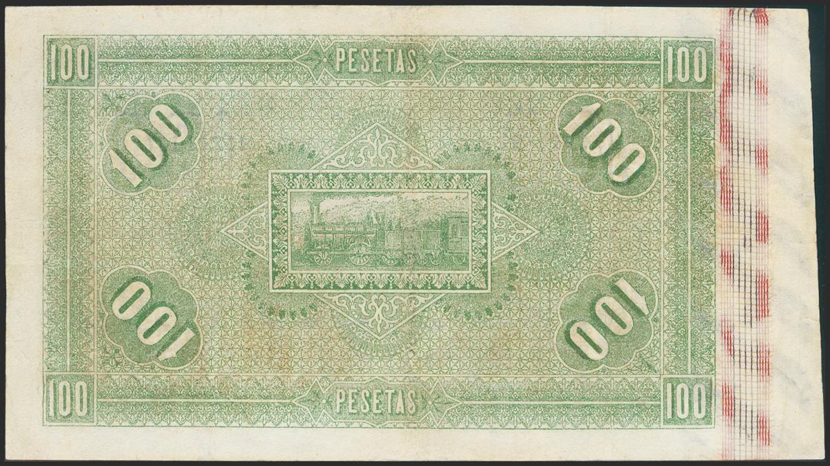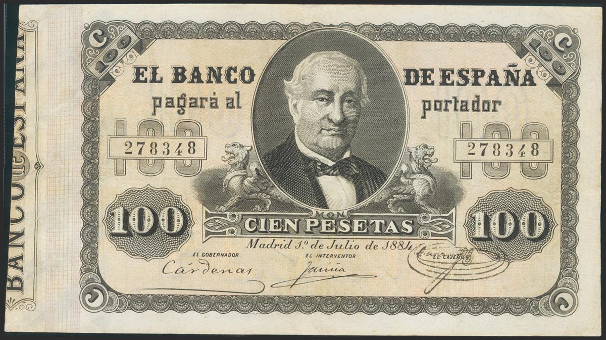 100 pesetas. July 1, 1884. (Edifil 2021: 289). Rare specimen, repaired in the central fold. Almost Extremely Fine.