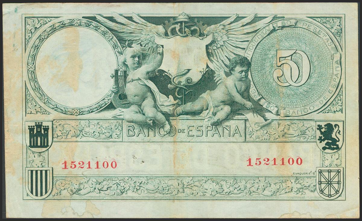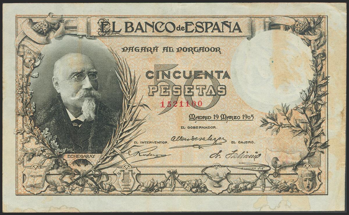 50 Pesetas. March 19, 1905. Without series. (Edifil 2017: 312). Unusual, it shows part of the original finish and damp spots. Good Very Fine.
