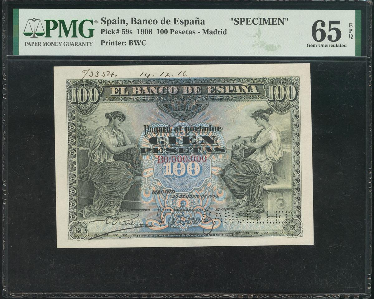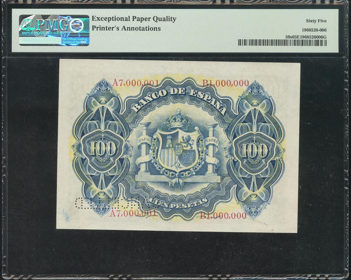 100 pesetas. June 30, 1906. Numbering B0.000.000, CANCELLED drilled in the place intended for the cashier's signature. (Edifil 2021: 313P). Uncirculated. Packaged PMG65EPQ.