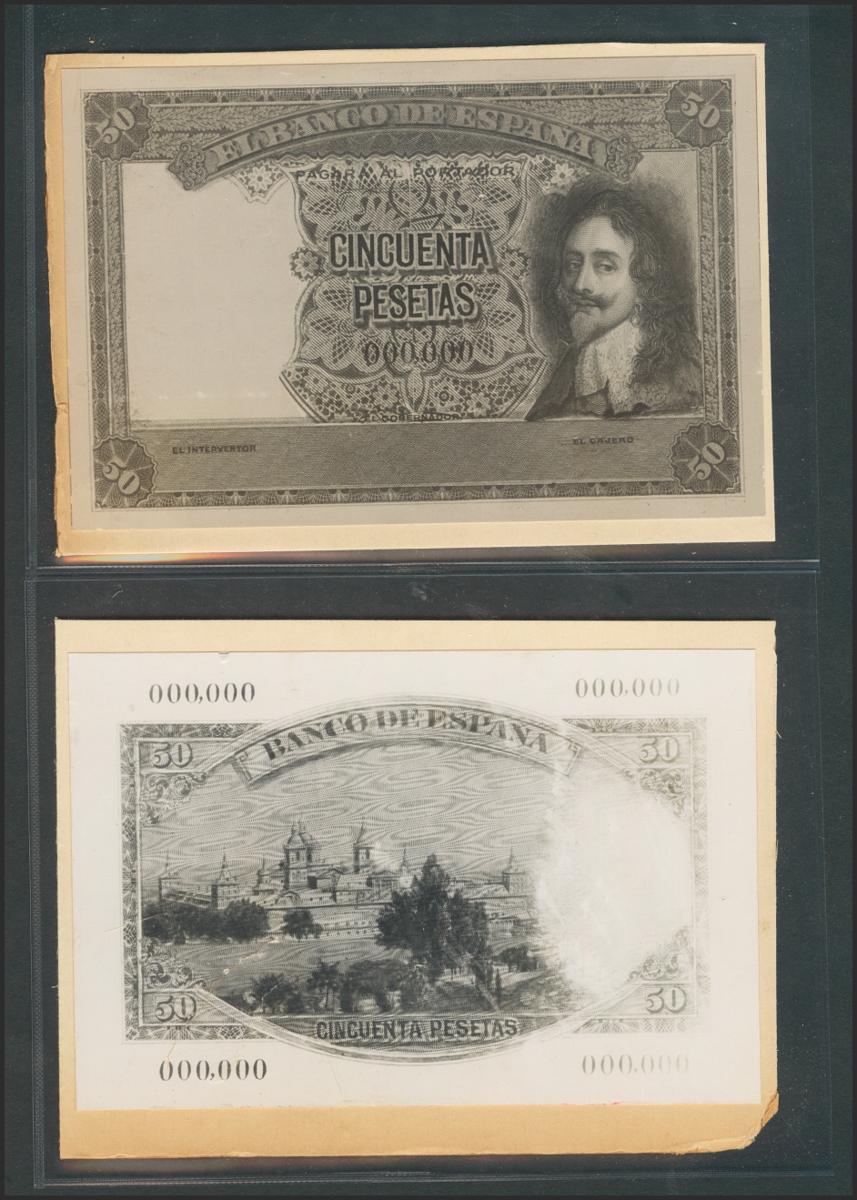 Set of 2 photographic evidence of a non-issued 50 Pesetas banknote, presenting the bust of Charles I of England (includes proof of the front and back with the number 000000). Beautiful and very rare set of an unpublished banknote to date.