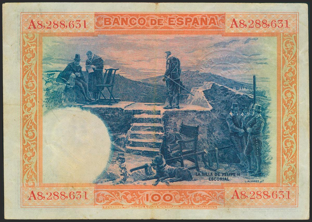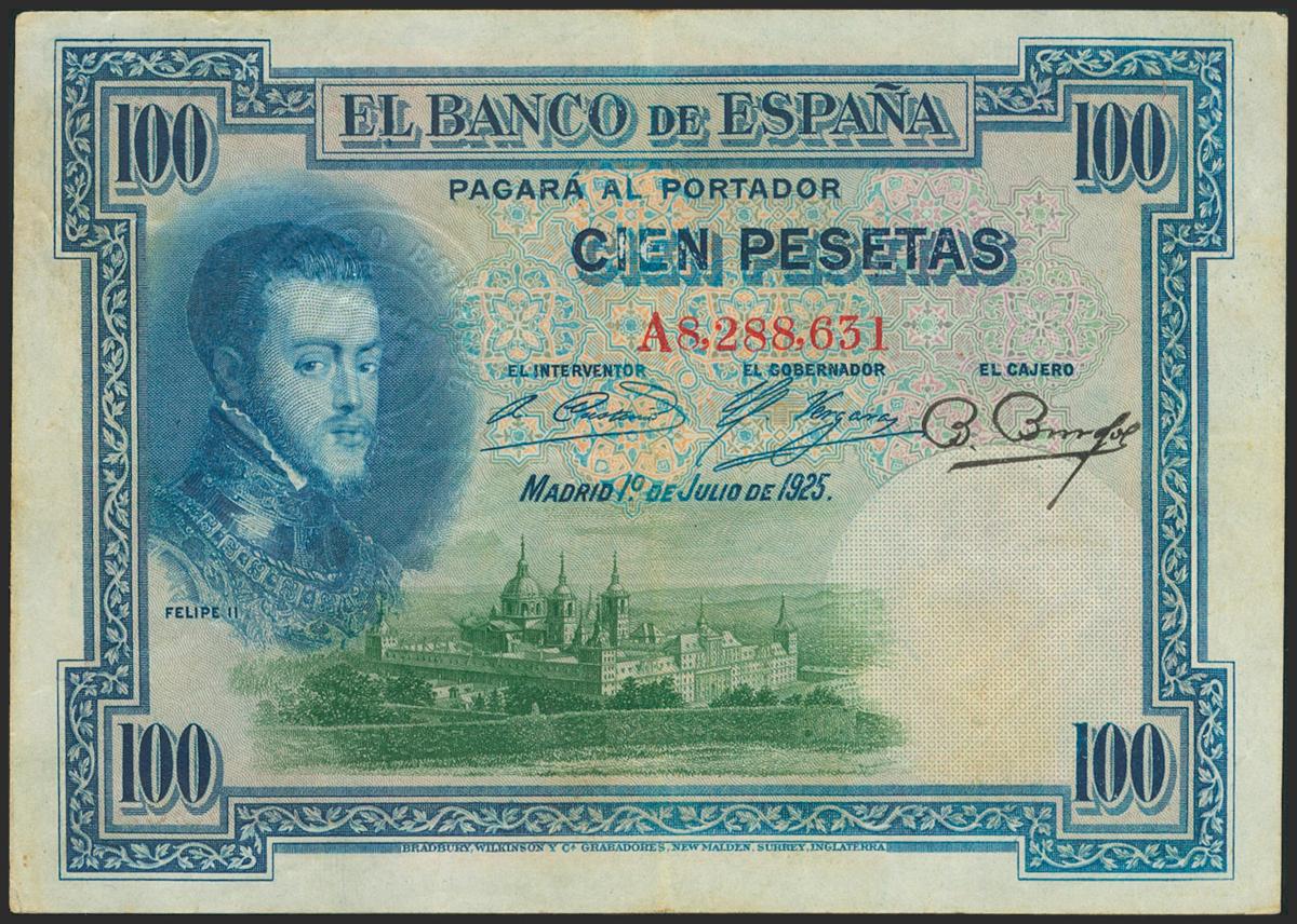 100 pesetas. July 1, 1925. Series A and dry stamp STATE / SPANISH. (Edifil 2021: 323a). Retains much of the original size. Good Very Fine.