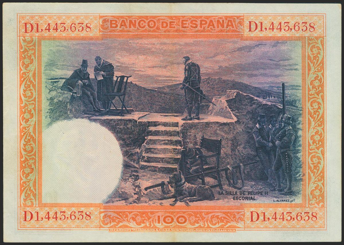 100 pesetas. July 1, 1925. Series D and STATE / SPANISH dry stamp. (Edifil 2021: 323a). Retains much of the original size. Good Very Fine.