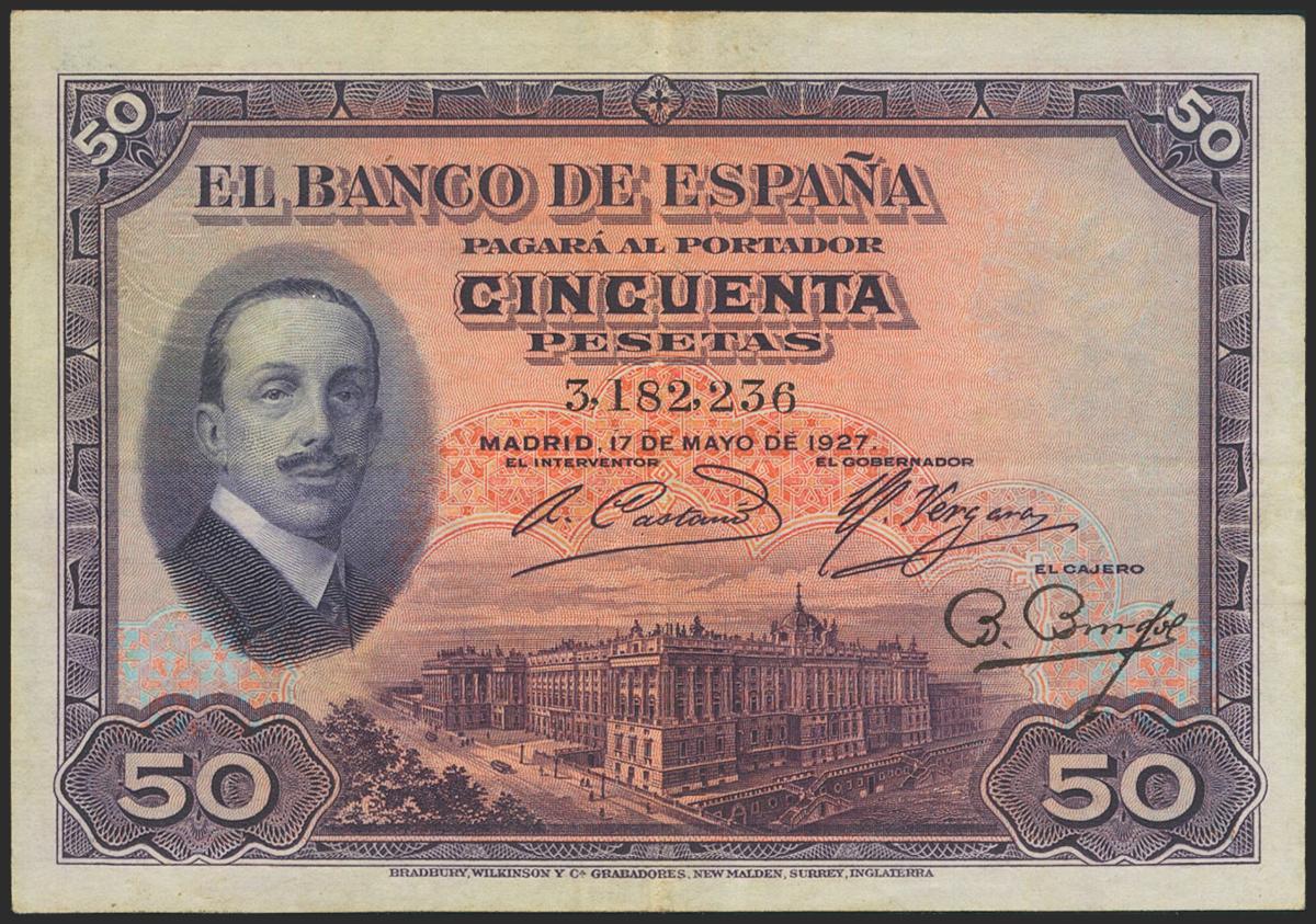50 Pesetas. May 17, 1927. Without series. (Edifil 2021: 326). Very Fine.