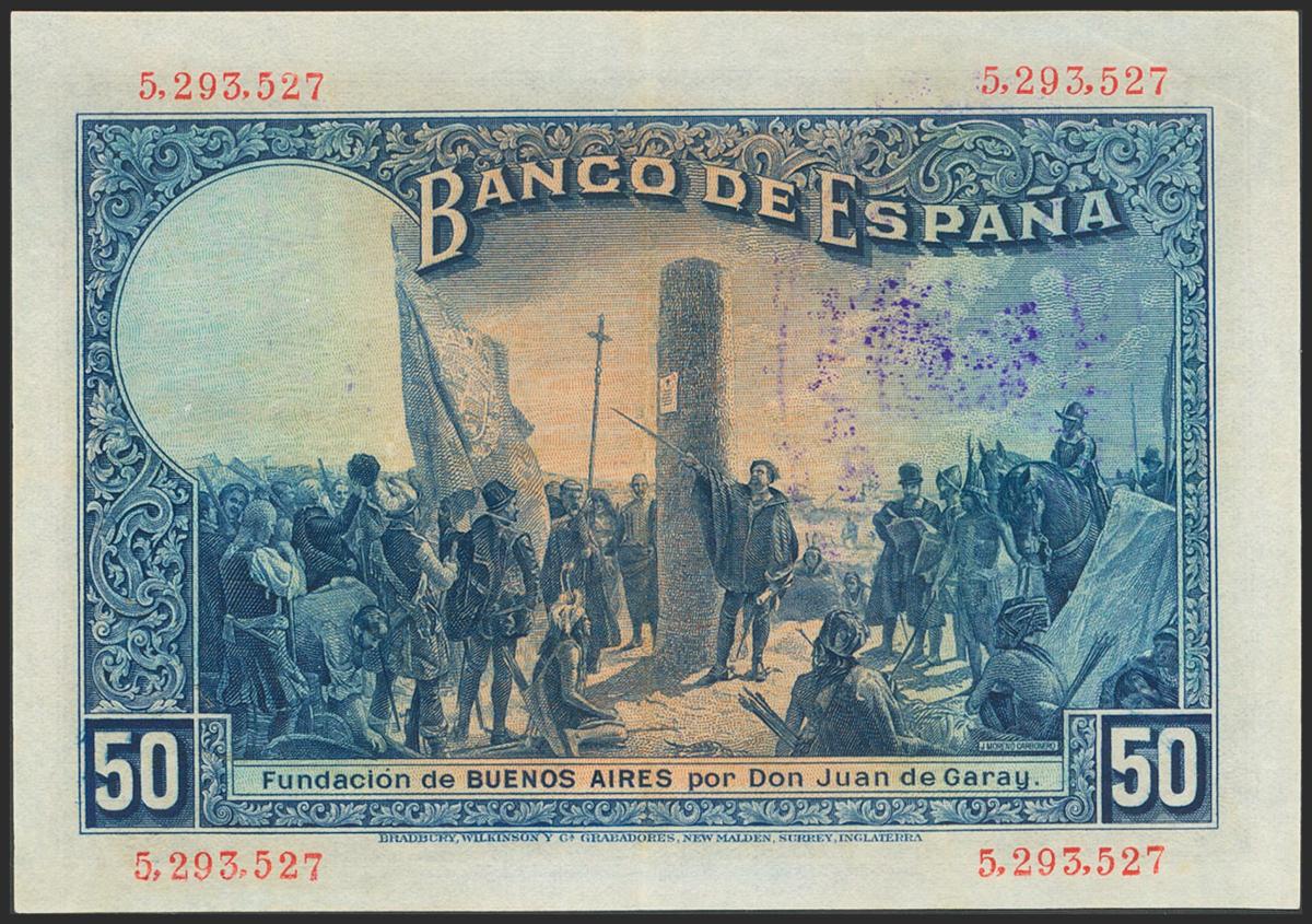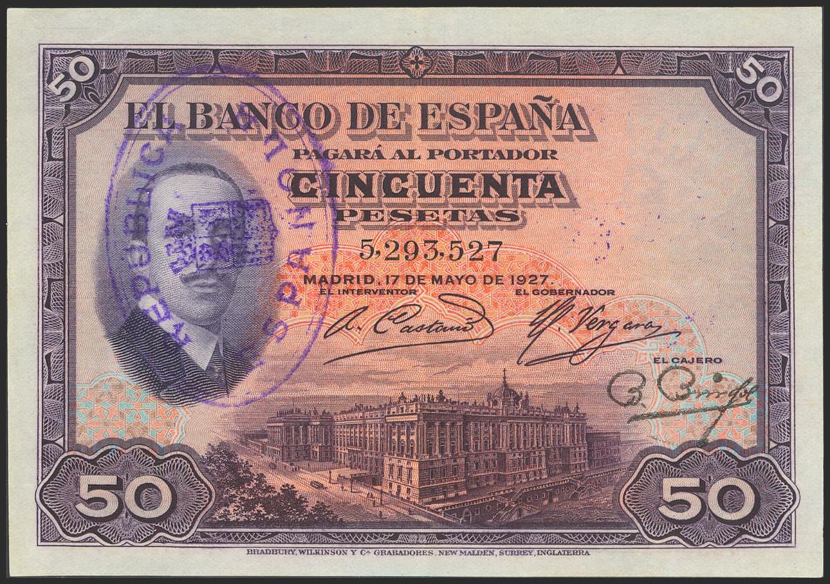 50 Pesetas. May 17, 1927. Without serial and rubber stamp REPUBLIC / SPANISH. (Edifil 2021: 332). Almost Extremely Fine.