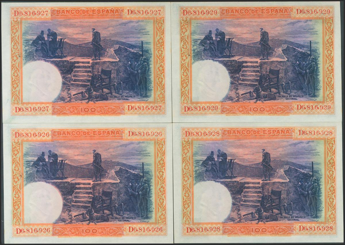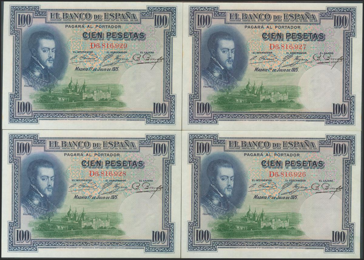Set of 4 correlative banknotes of 100 Pesetas issued on July 1, 1925, with the series D. (Edifil 2021: 350). Original sizing. Almost Uncirculated.