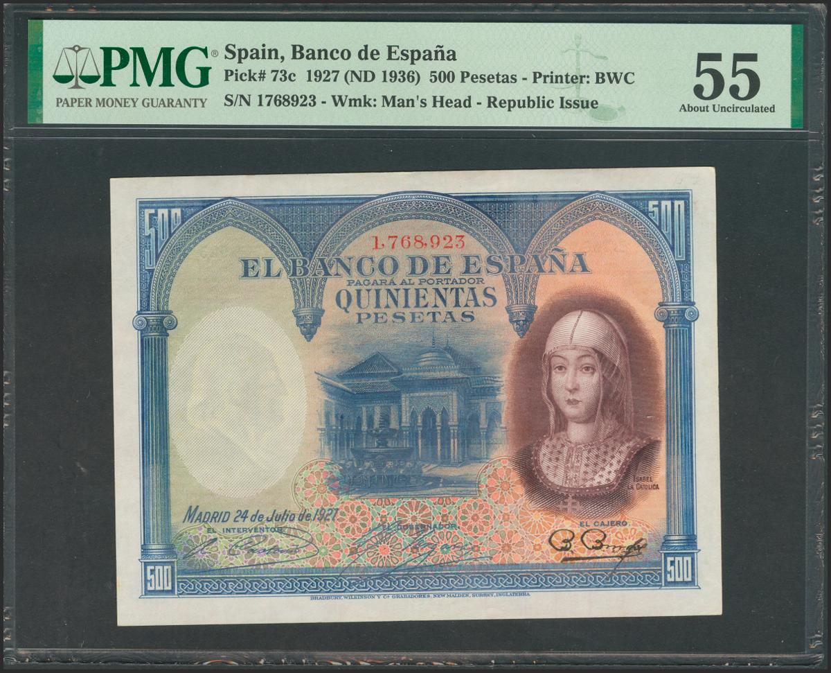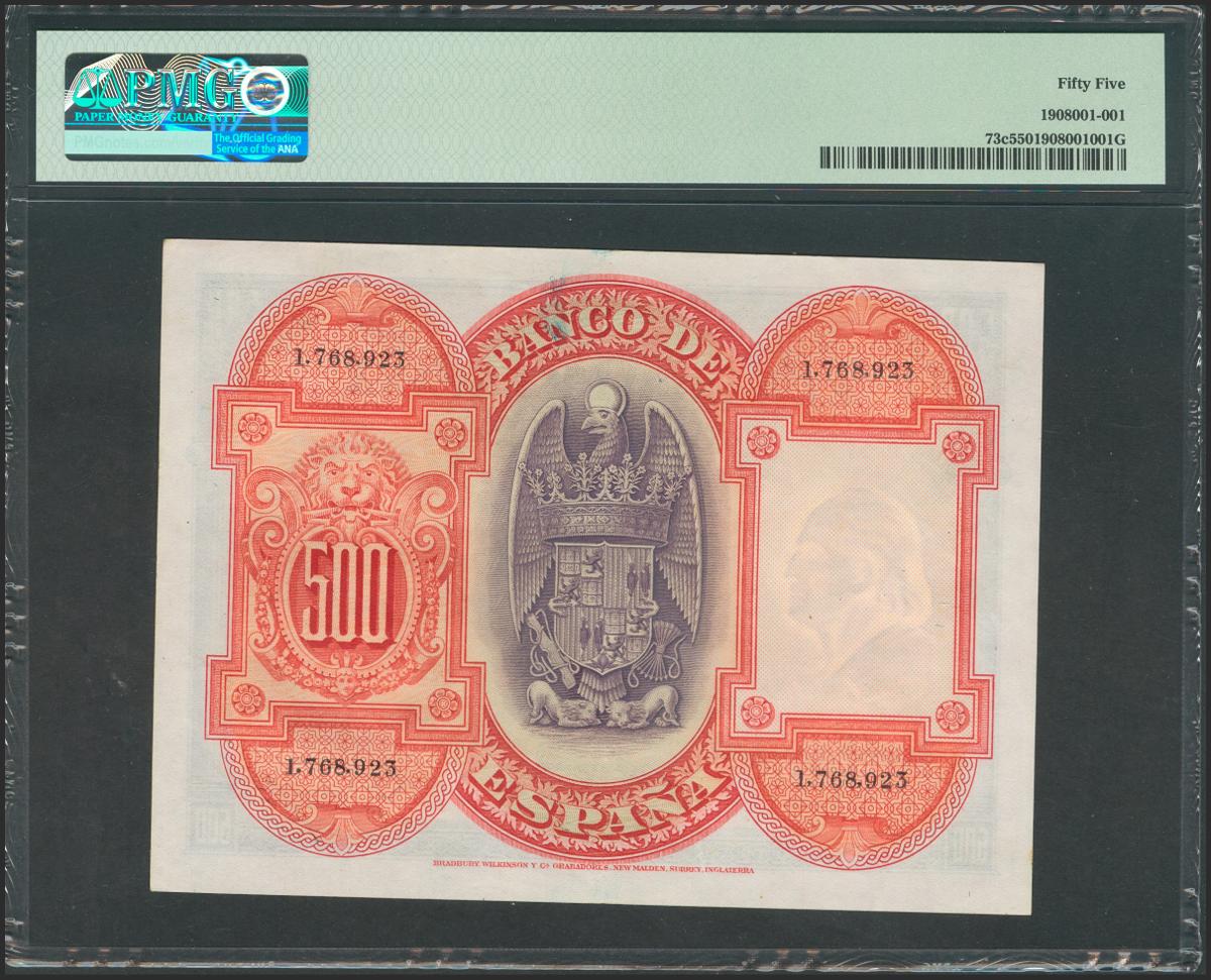 500 pesetas. July 24, 1927. No series and numbering after 1602000. (Edifil 2017: 352). Very rare in this conservation. Good Extremely Fine. Packaged PMG55.