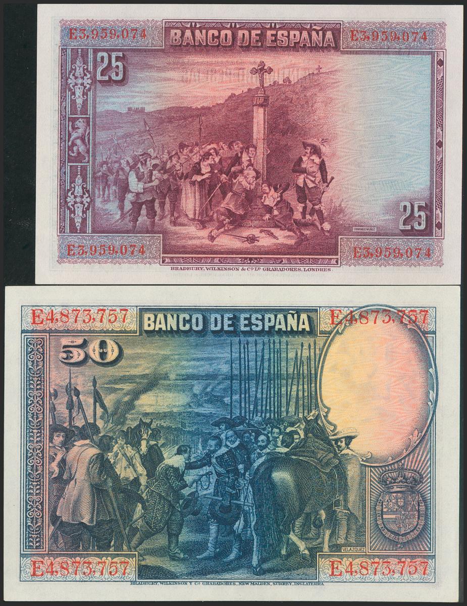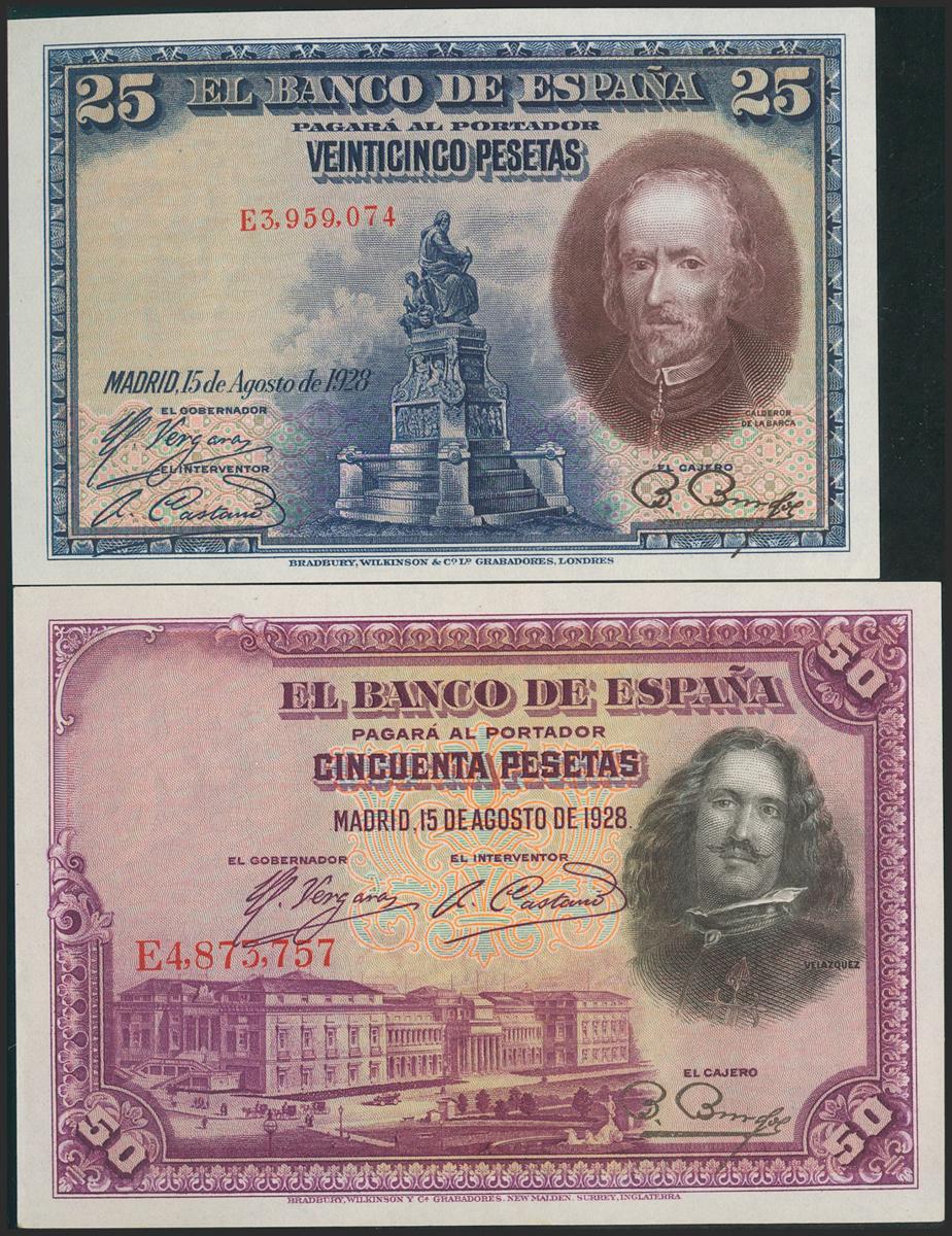 English Set of 2 banknotes of 25 Pesetas and 50 Pesetas, issued on August 15, 1928, both with the series E. (Edifil 2021: 353, 354). Original sizing. Uncirculated.