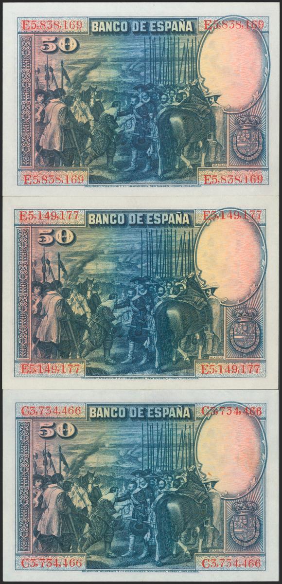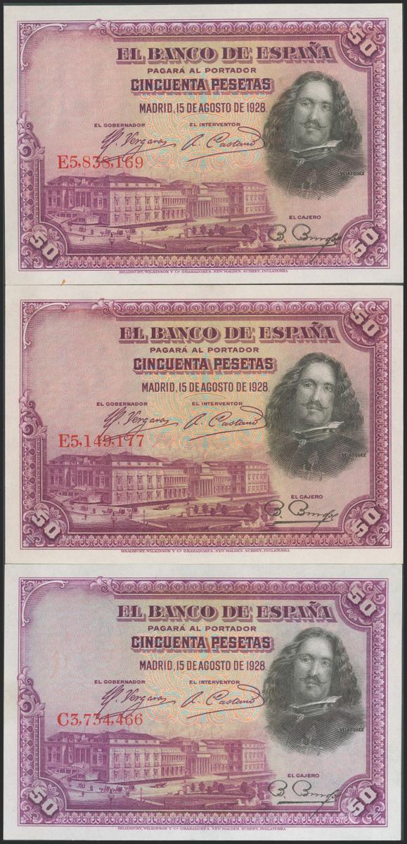 Set of 3 50 Pesetas banknotes issued on August 15, 1928, with series C, E (2). (Edifil 2021: 354). Original sizing. Uncirculated/ Good Extremely Fine.