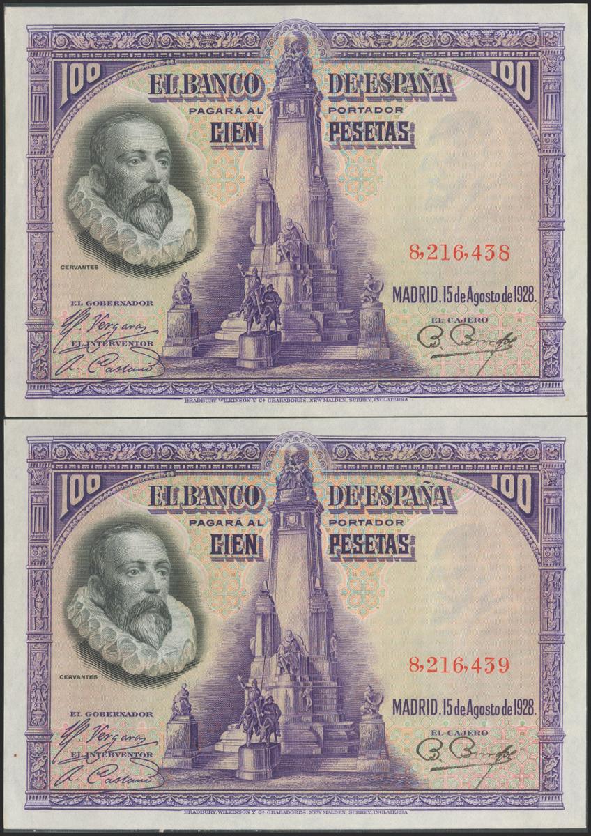 100 pesetas. August 15, 1928. Correlative couple. No serie. (Edifil 2021: 355). Retains much of the original size. Good Extremely Fine.