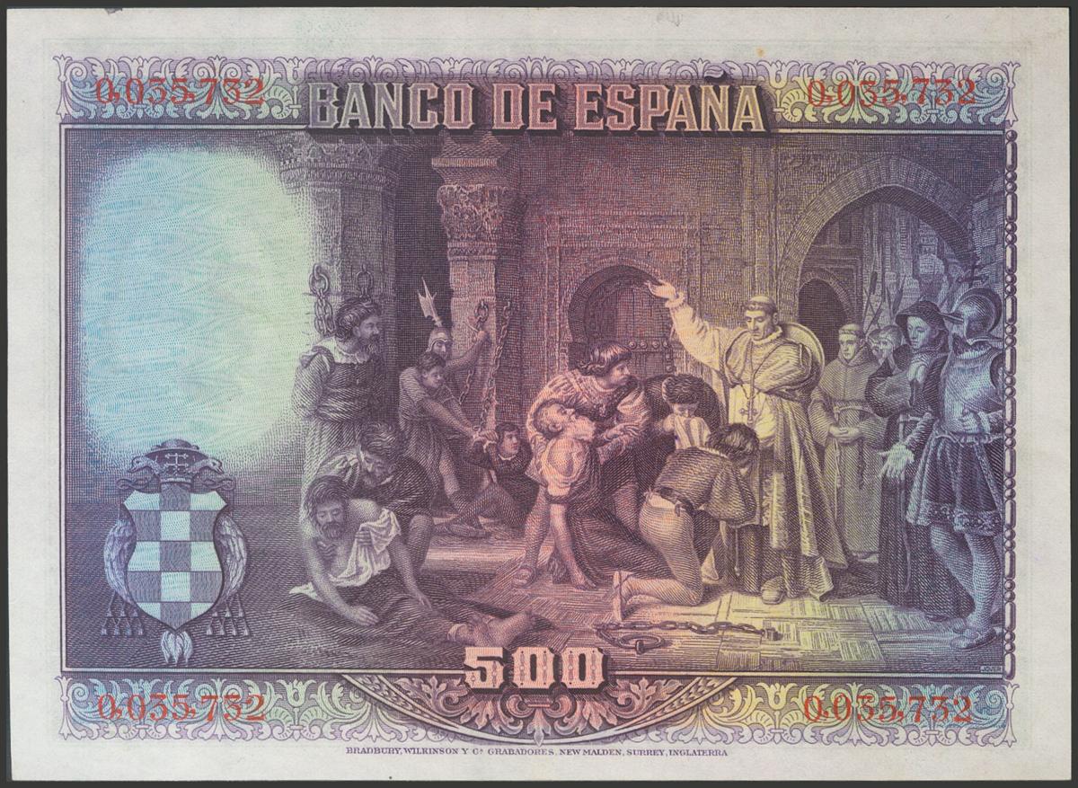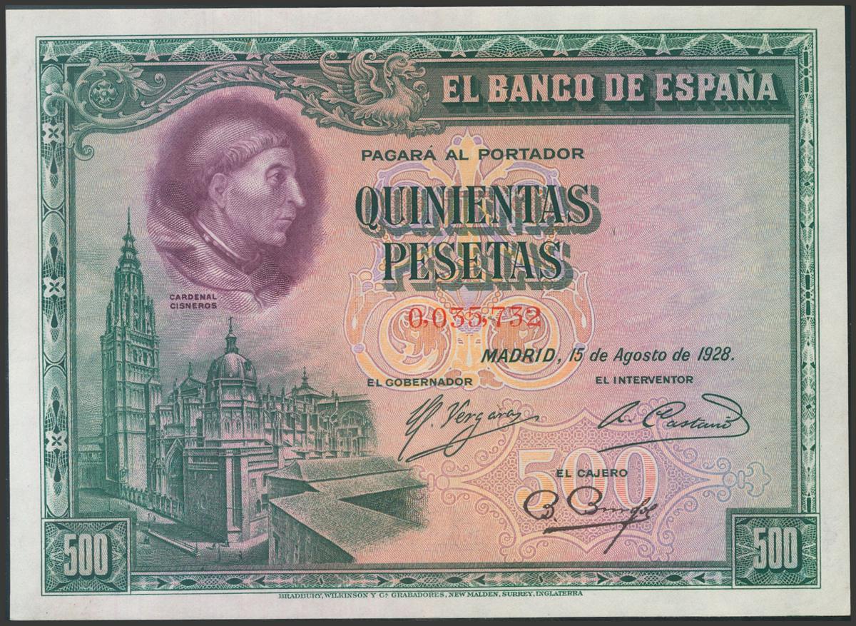 English 500 pesetas. August 15, 1928. Without series and low numbering. (Edifil 2017: 356). It keeps all the original sizing. Good Extremely Fine.