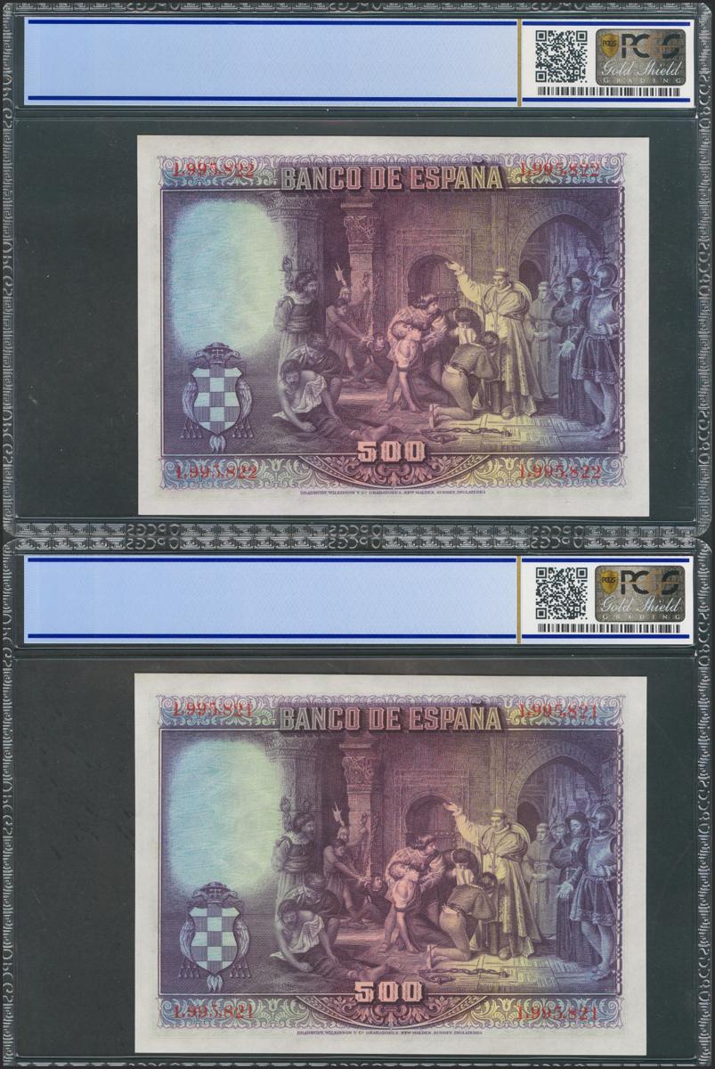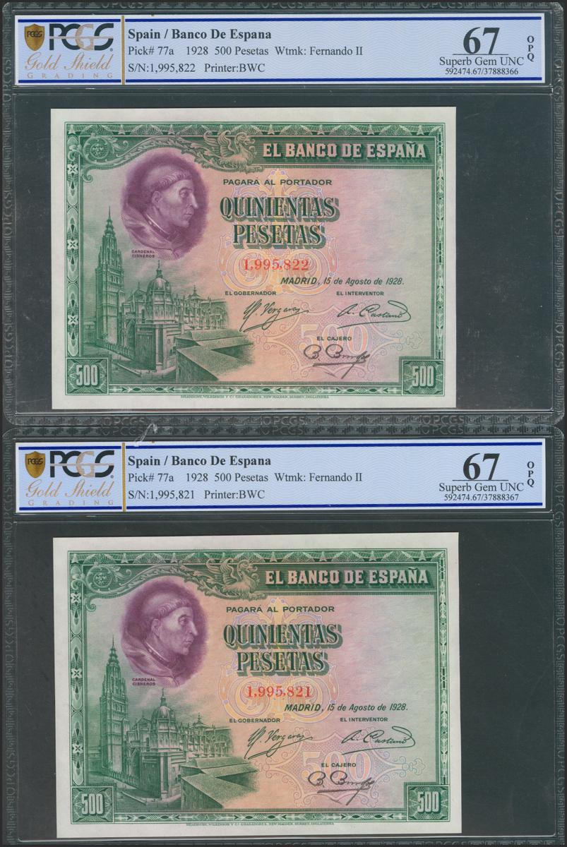 English 500 pesetas. August 15, 1928. Correlative couple. No serie. (Edifil 2021: 356). Original sizing. Uncirculated. PCGS67OPQ package, both.
