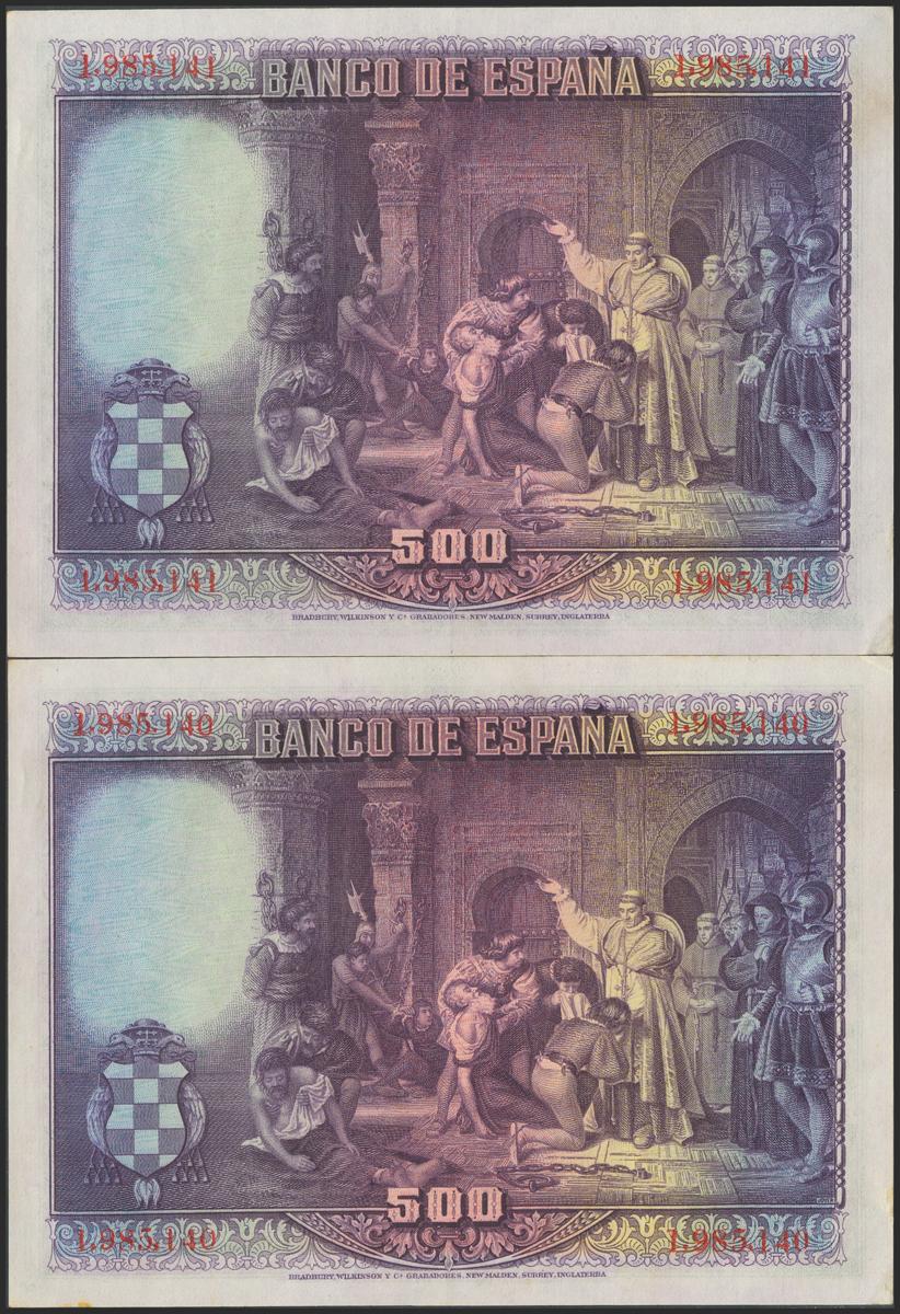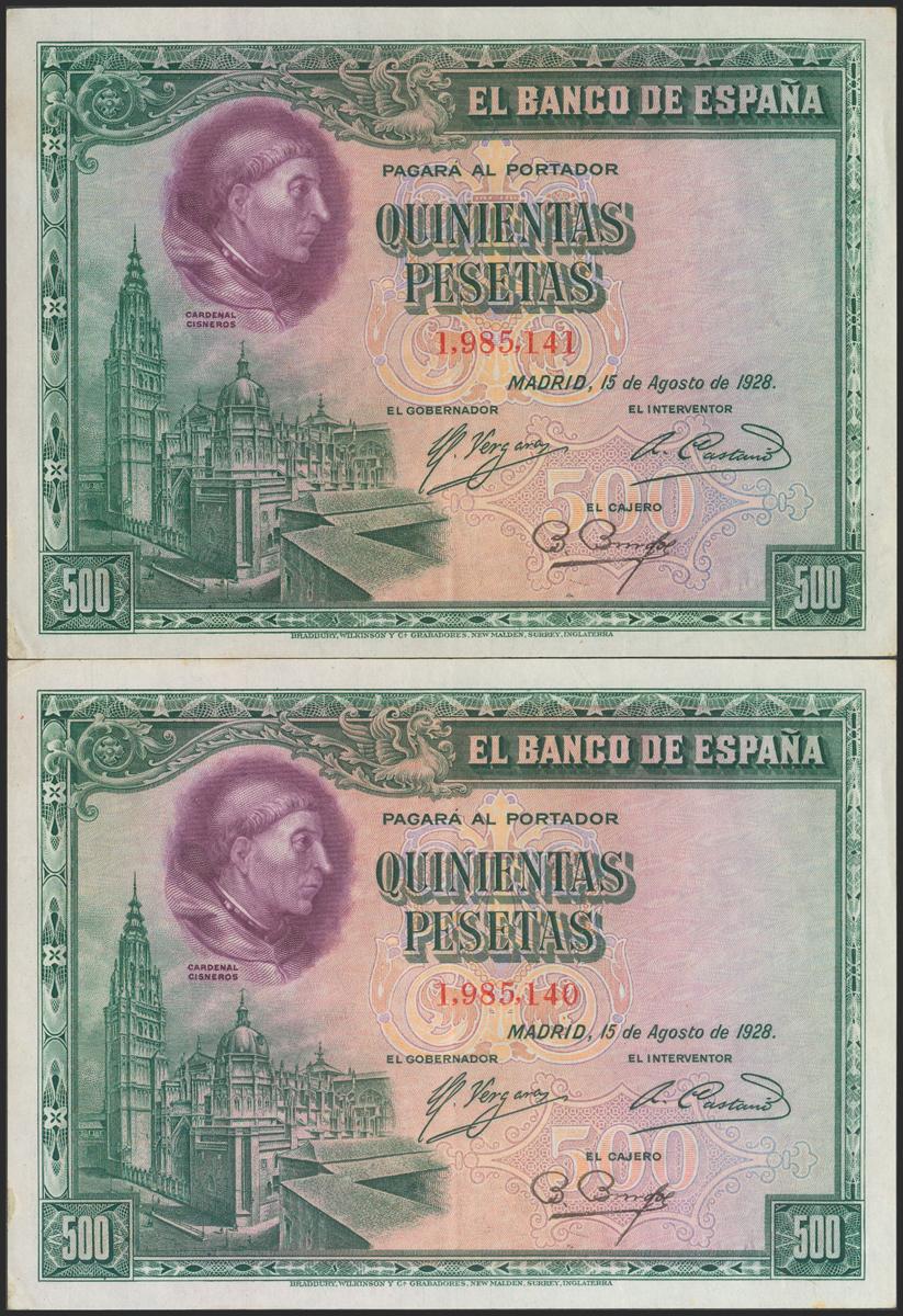 500 pesetas. August 15, 1928. Correlative couple. No serie. (Edifil 2021: 356). It retains part of the original size. Extremely Fine.