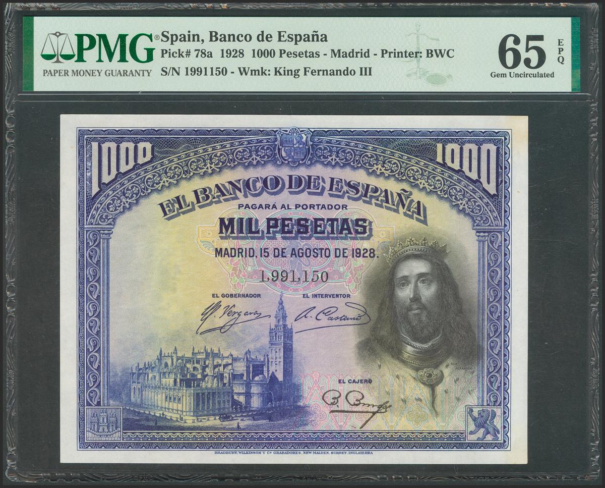 1000 Pesetas. August 15, 1928. Without series. (Edifil 2021: 357). Original sizing. Uncirculated. Packaged PMG65EPQ.