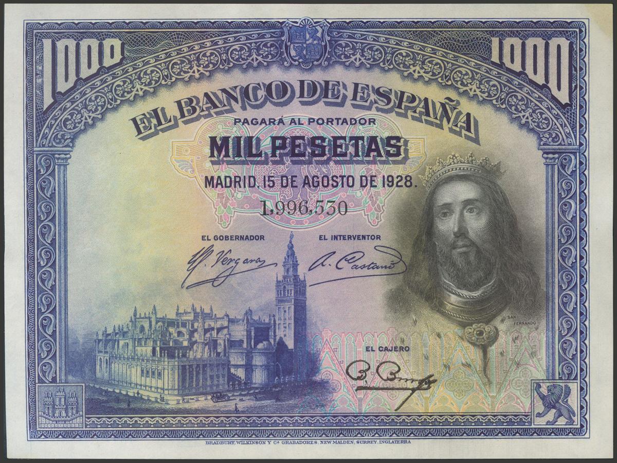 1000 Pesetas. August 15, 1928. Without series. (Edifil 2017: 357). It keeps all its original size. Almost Uncirculated.