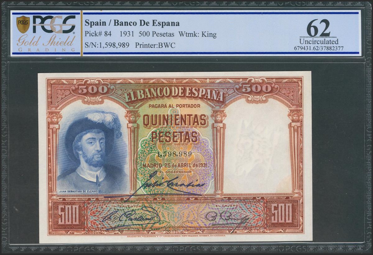 English 500 pesetas. April 25, 1931. (Edifil 2021: 361). Uncirculated. Encapsulated PCGS62.