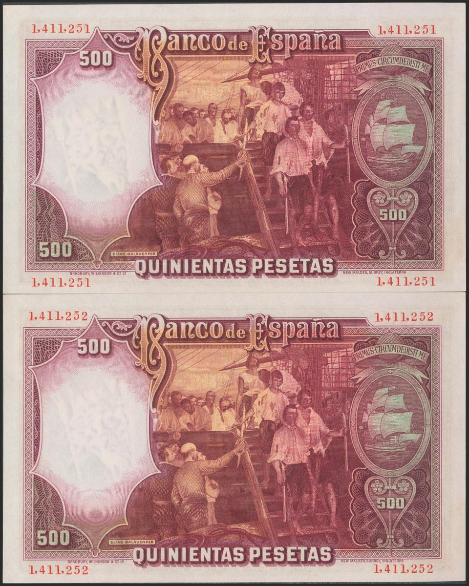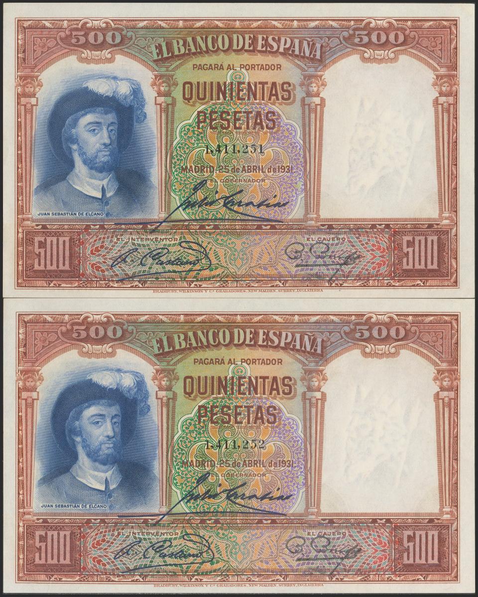 English 500 pesetas. April 25, 1931. Correlative pair. No serie. (Edifil 2021: 361). Original sizing. Uncirculated.