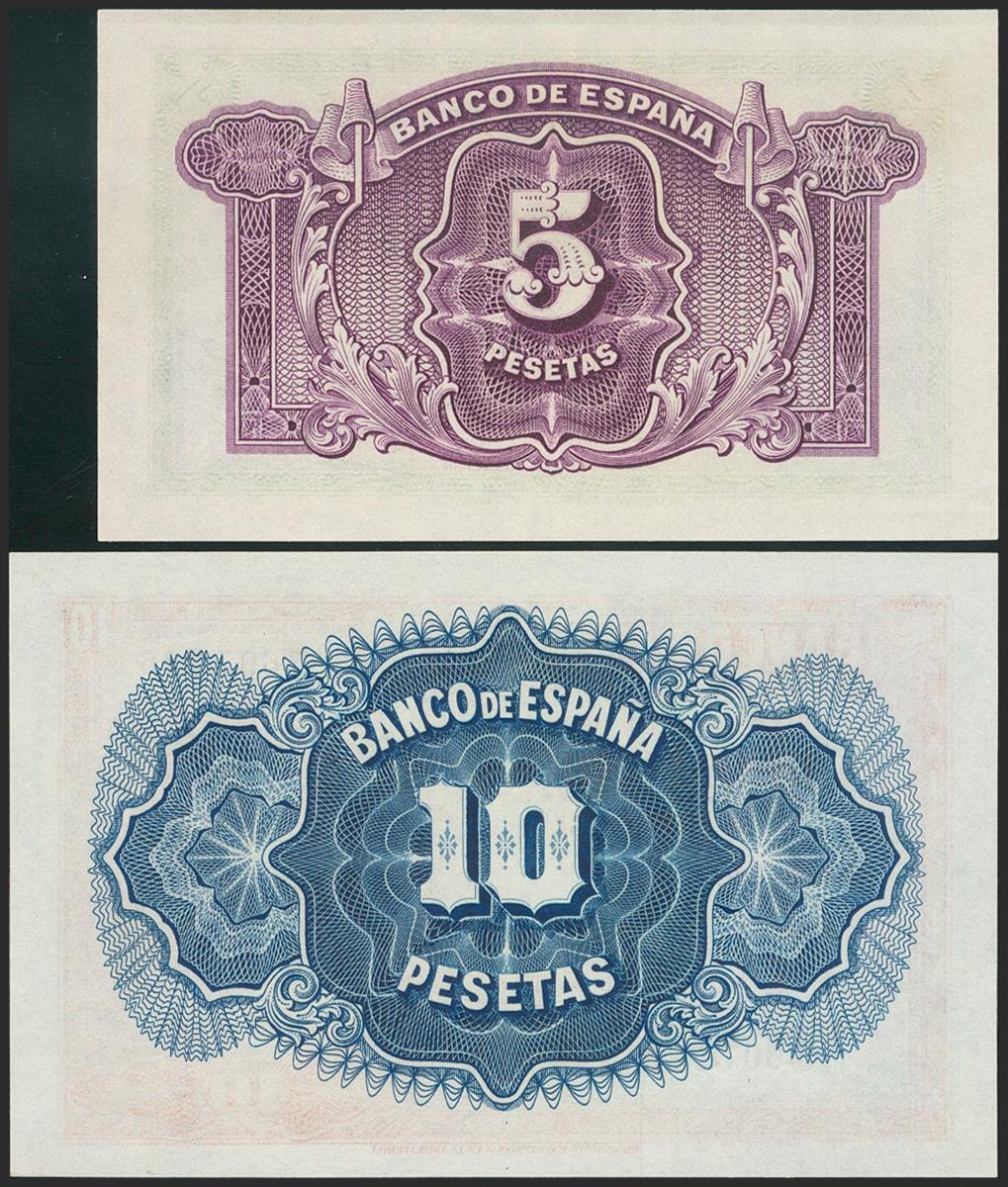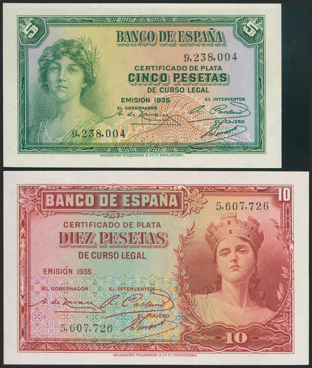 English 5 Pesetas and 10 Pesetas. 1935. Silver Certificate. No serie. (Edifil 2021: 363, 364). Original sizing. Uncirculated/ Almost Uncirculated.