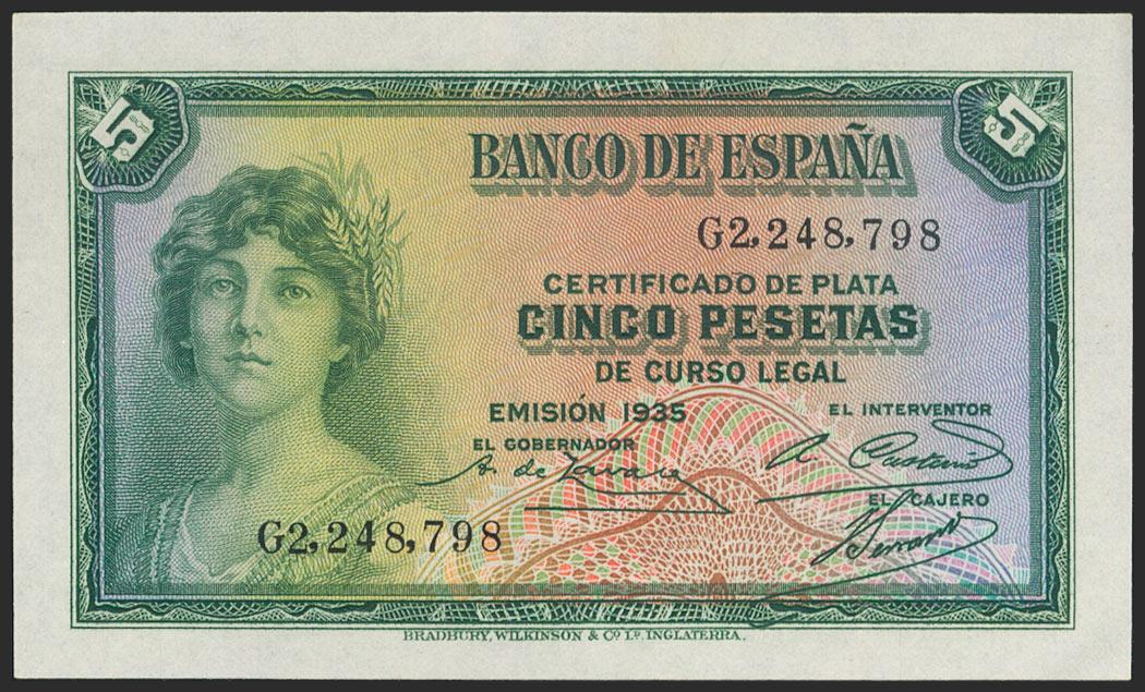 5 Pesetas. 1935. Silver Certificate. Series G. (Edifil 2021: 363a). Original sizing. Almost Uncirculated.