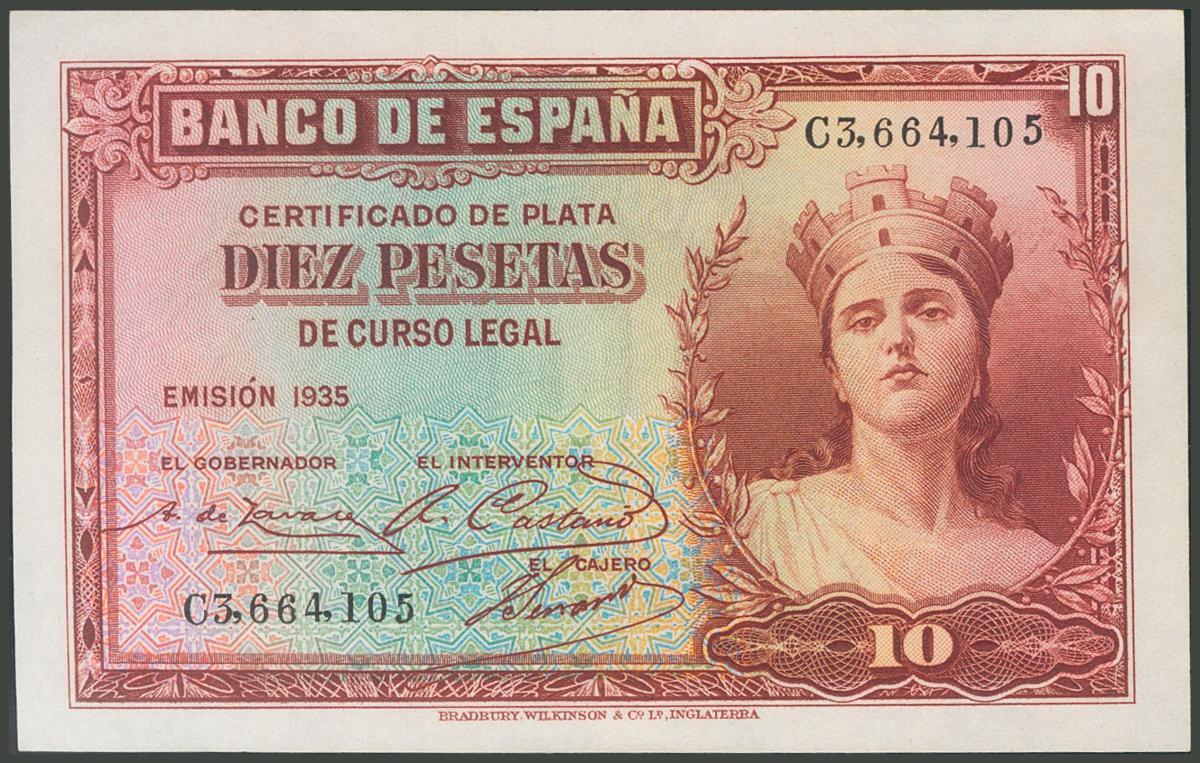 10 Pesetas. 1935. Silver Certificate. Series C, last series issued. (Edifil 2017: 364). Original sizing. Good Extremely Fine.