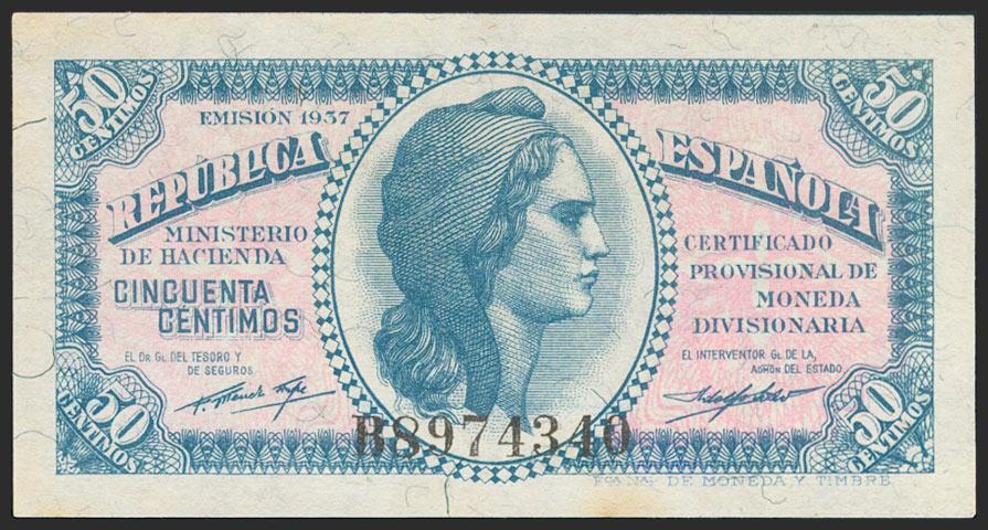 50 cents. 1937. Ministry of Finance. Series B. (Edifil 2021: 391). Original sizing, spot on the bottom margin. Almost Uncirculated.