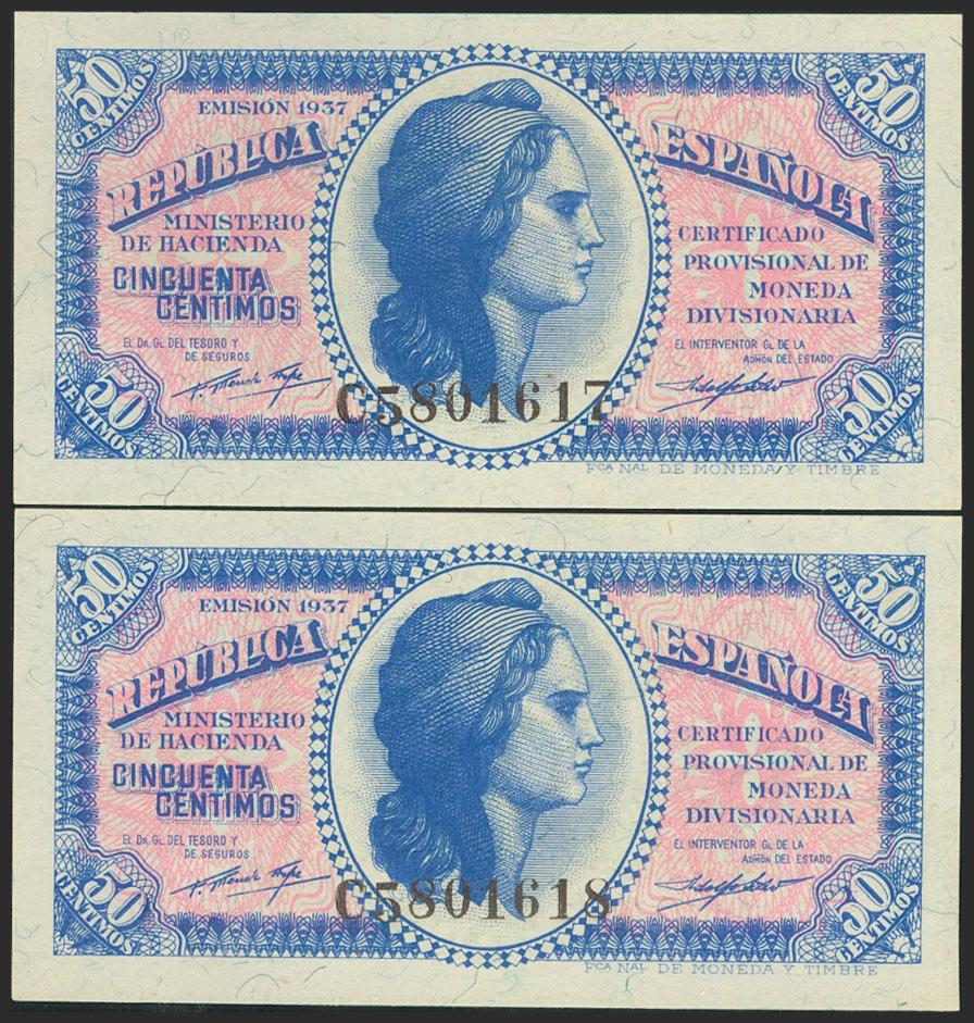 50 cents. 1937. Ministry of Finance. Correlative pair. Series C, last series issued. (Edifil 2021: 391a). Original sizing. Uncirculated.