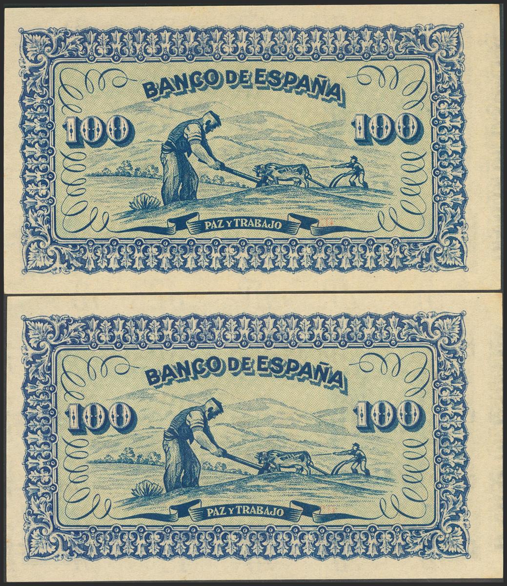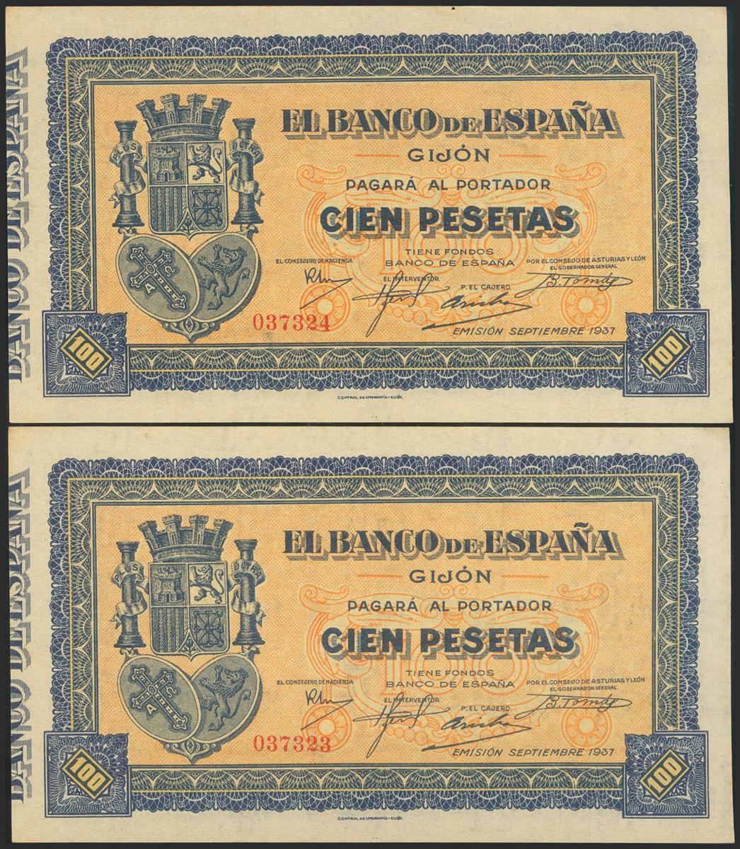 100 pesetas. September 1937. Correlative couple. Gijón branch. No serie. (Edifil 2021: 399). Original sizing. Almost Uncirculated.