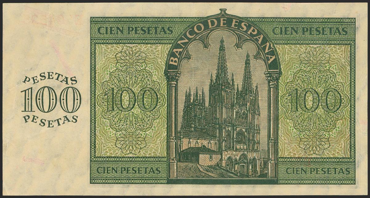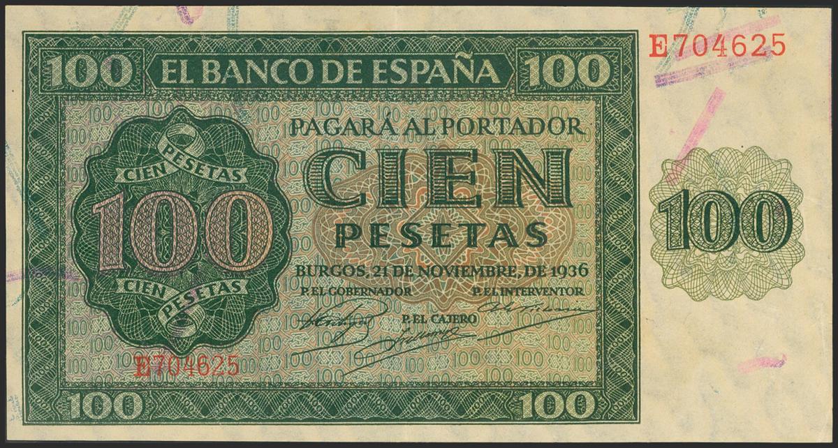 100 pesetas. November 21, 1936. Series E. (Edifil 2021: 421a). Retains much of the original size. Good Extremely Fine.