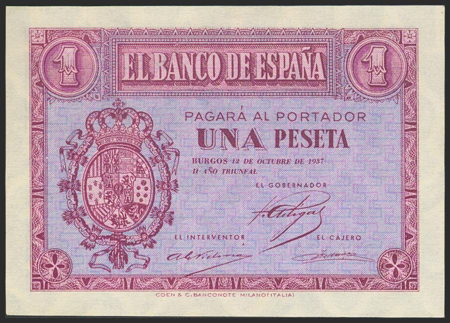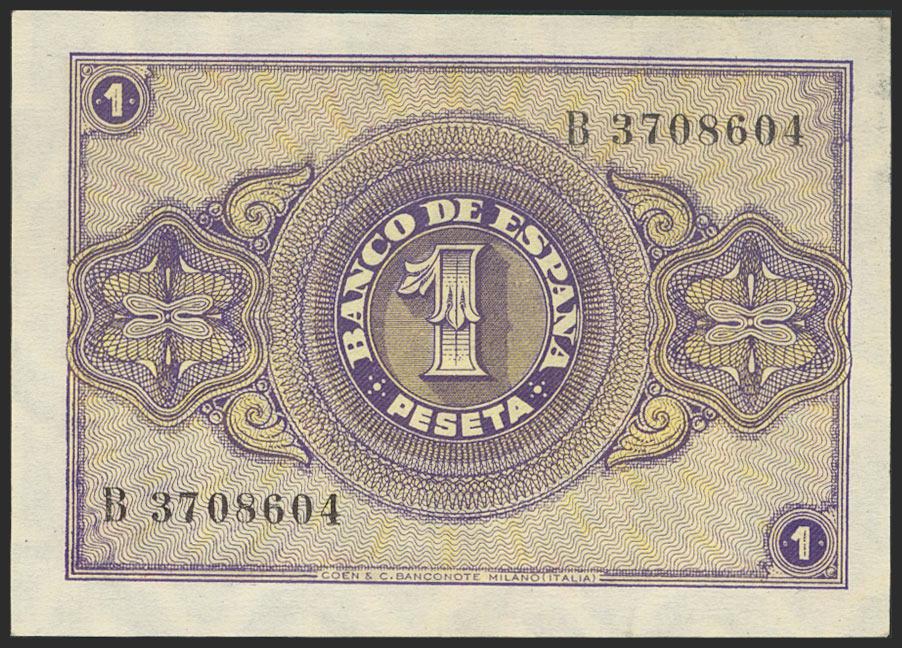 English 1 peseta. October 12, 1937. Series B. (Edifil 2021: 425a). It retains most of its size, it presents slight undulation-bending. Good Extremely Fine.