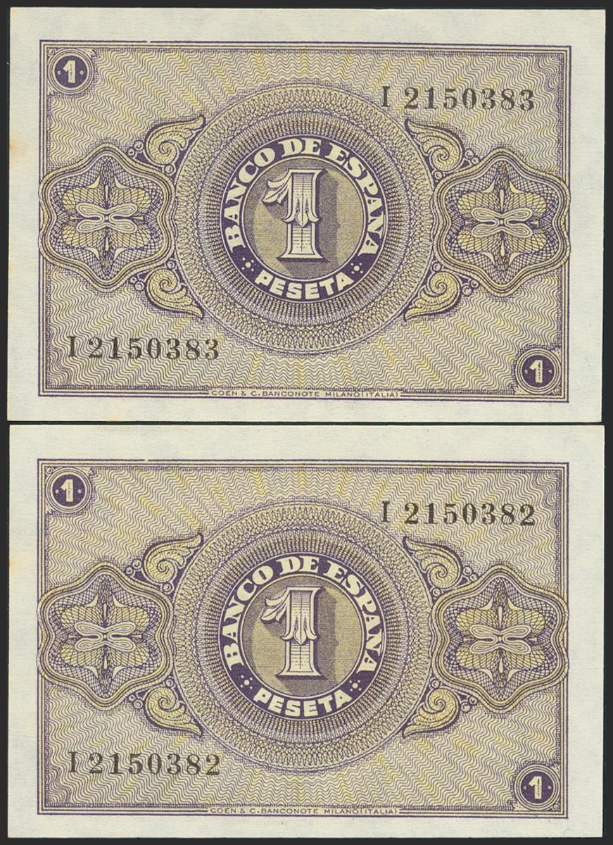 1 peseta. April 30, 1938. Correlative pair. Series I. (Edifil 2021: 428a). Original sizing. Almost Uncirculated.