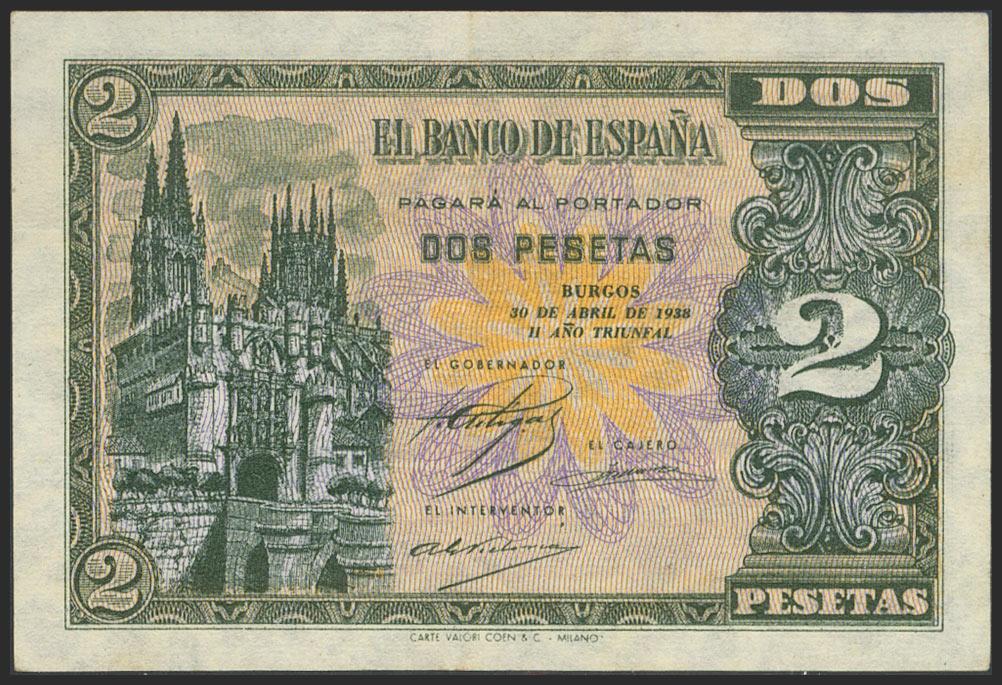 2 Pesetas. April 30, 1938. Series B. (Edifil 2021: 429a). Retains much of the original size. Good Extremely Fine.