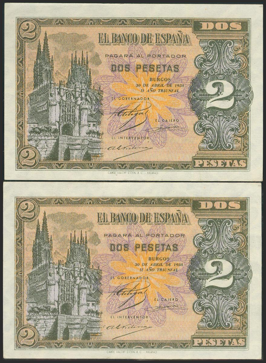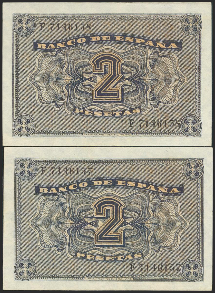 2 Pesetas. April 30, 1938. Correlative pair. Series F. (Edifil 2021: 429a). Retains much of the original size. Good Extremely Fine.