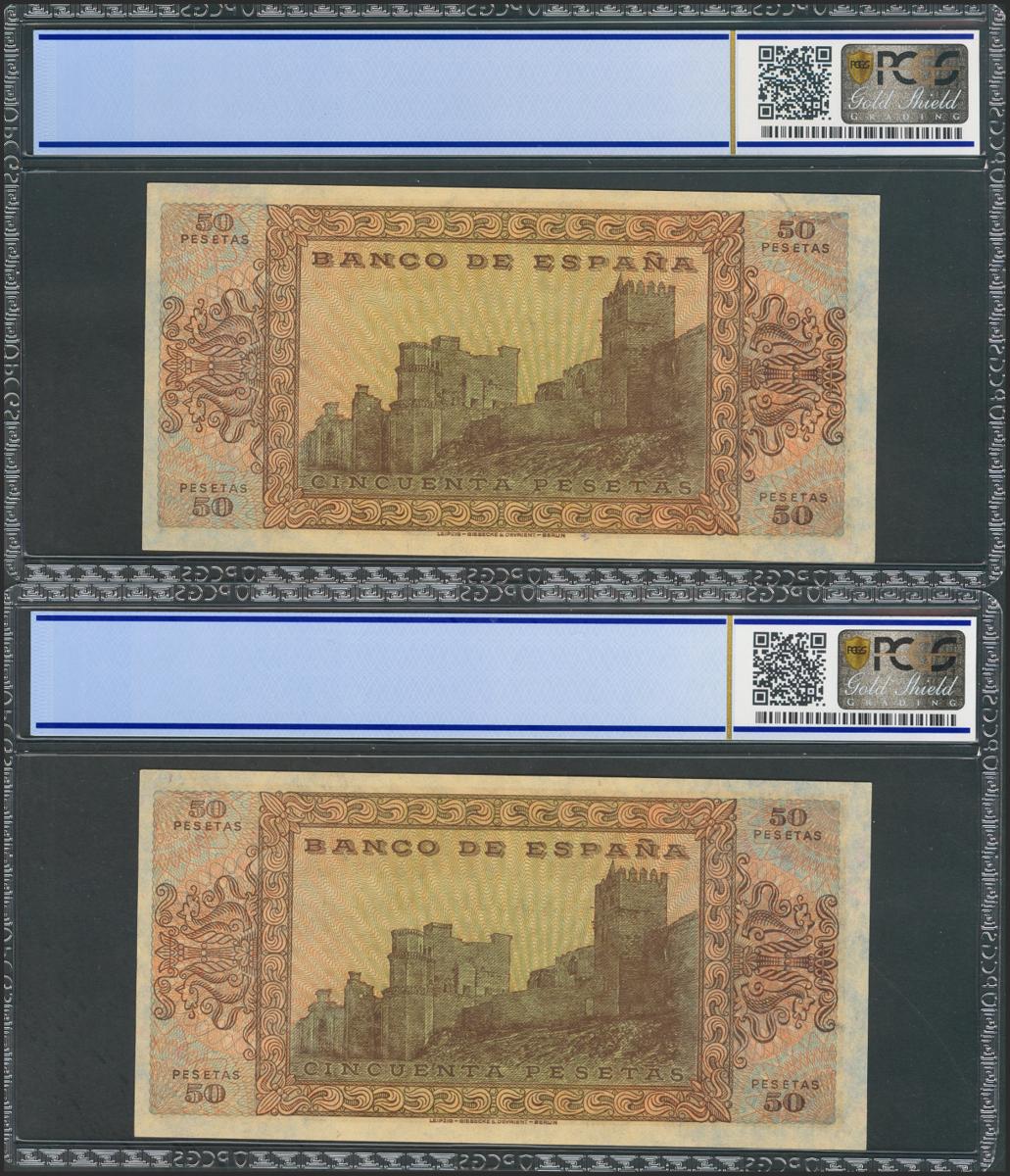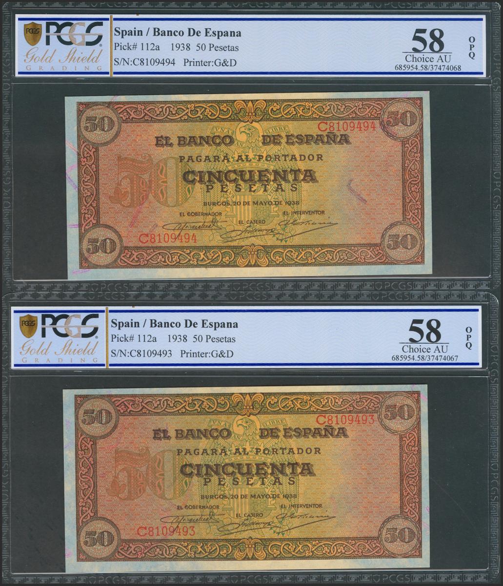 50 Pesetas. May 20, 1938. Correlative couple. Series C. (Edifil 2021: 431a). Original sizing. Good Extremely Fine. PCGS58OPQ package, both.