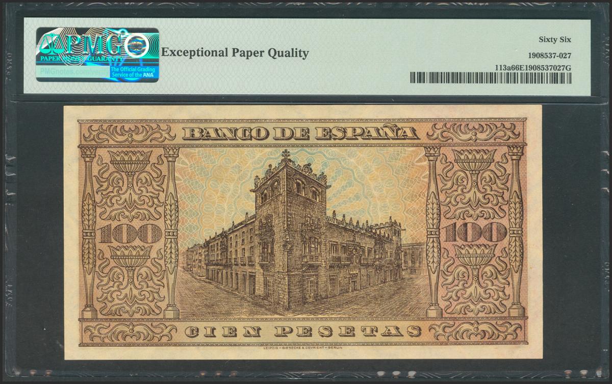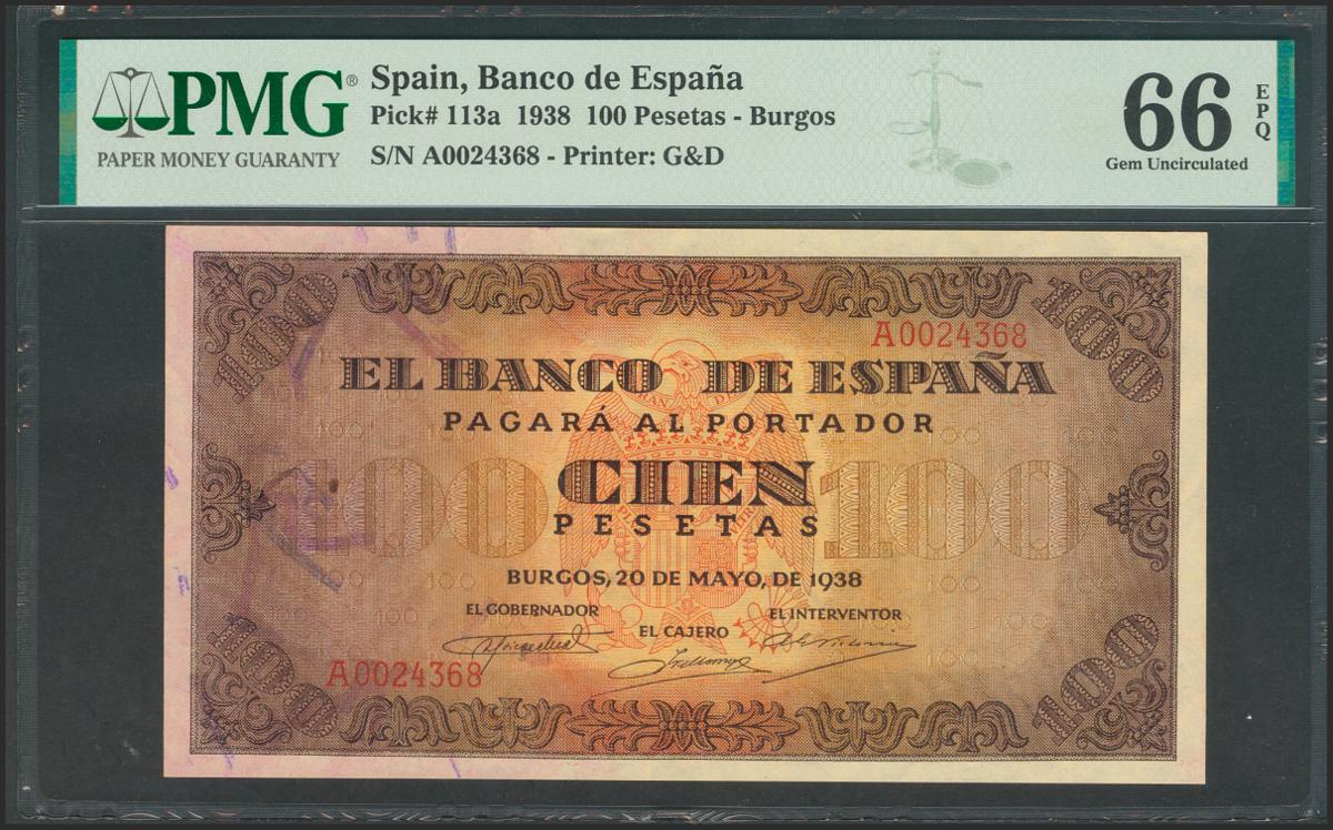 100 pesetas. May 20, 1938. Series A. (Edifil 2017: 432). Very rare in this exceptional quality, preserving all its original size. Uncirculated. PMG66EPQ package.