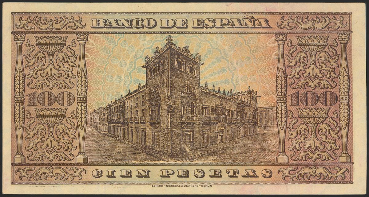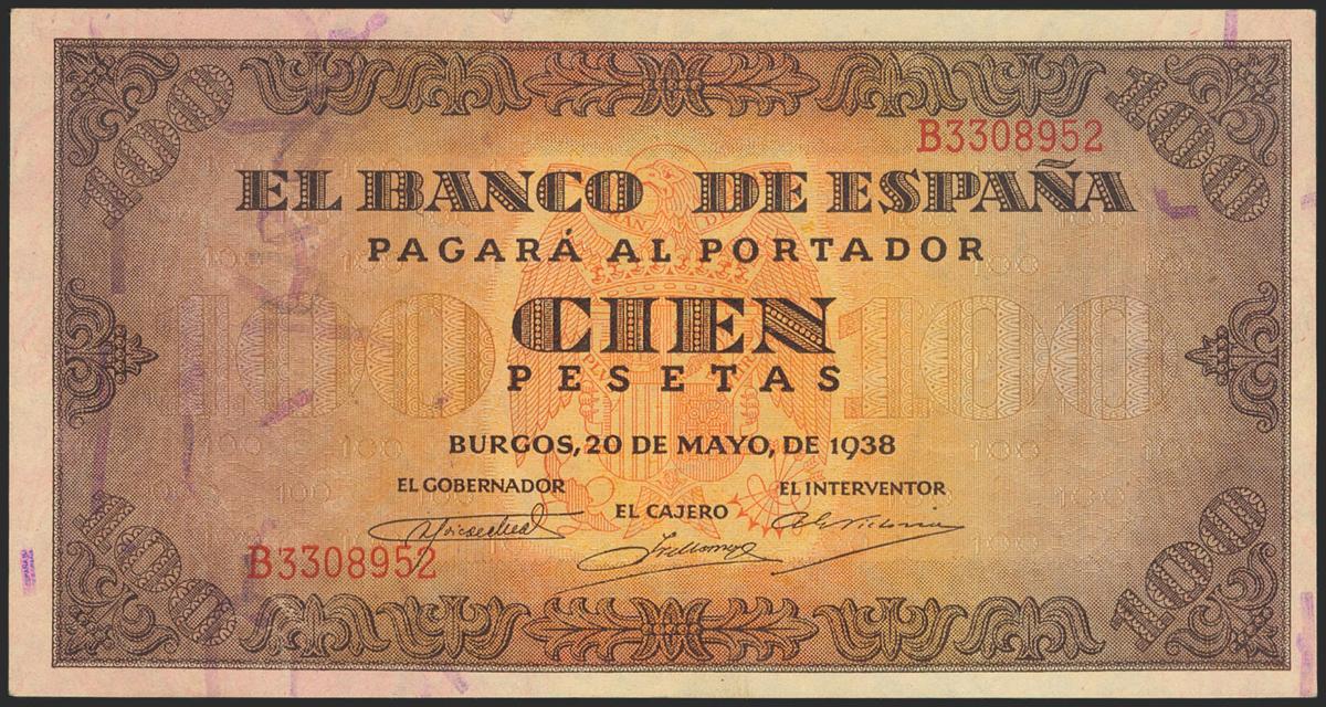 100 pesetas. May 20, 1938. Series B. (Edifil 2021: 432a). Retains much of the original size. Good Extremely Fine.