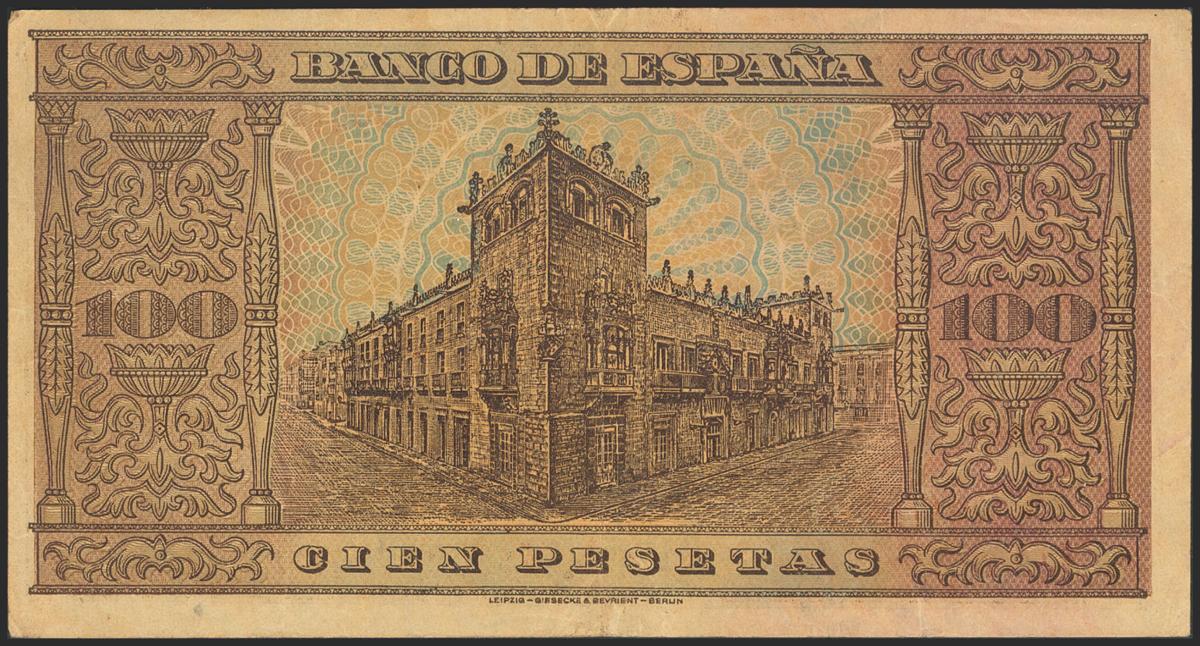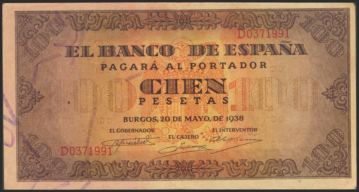 English 100 pesetas. May 20, 1938. Series D. (Edifil 2021: 432a). Presents some original sizing. Almost Extremely Fine.