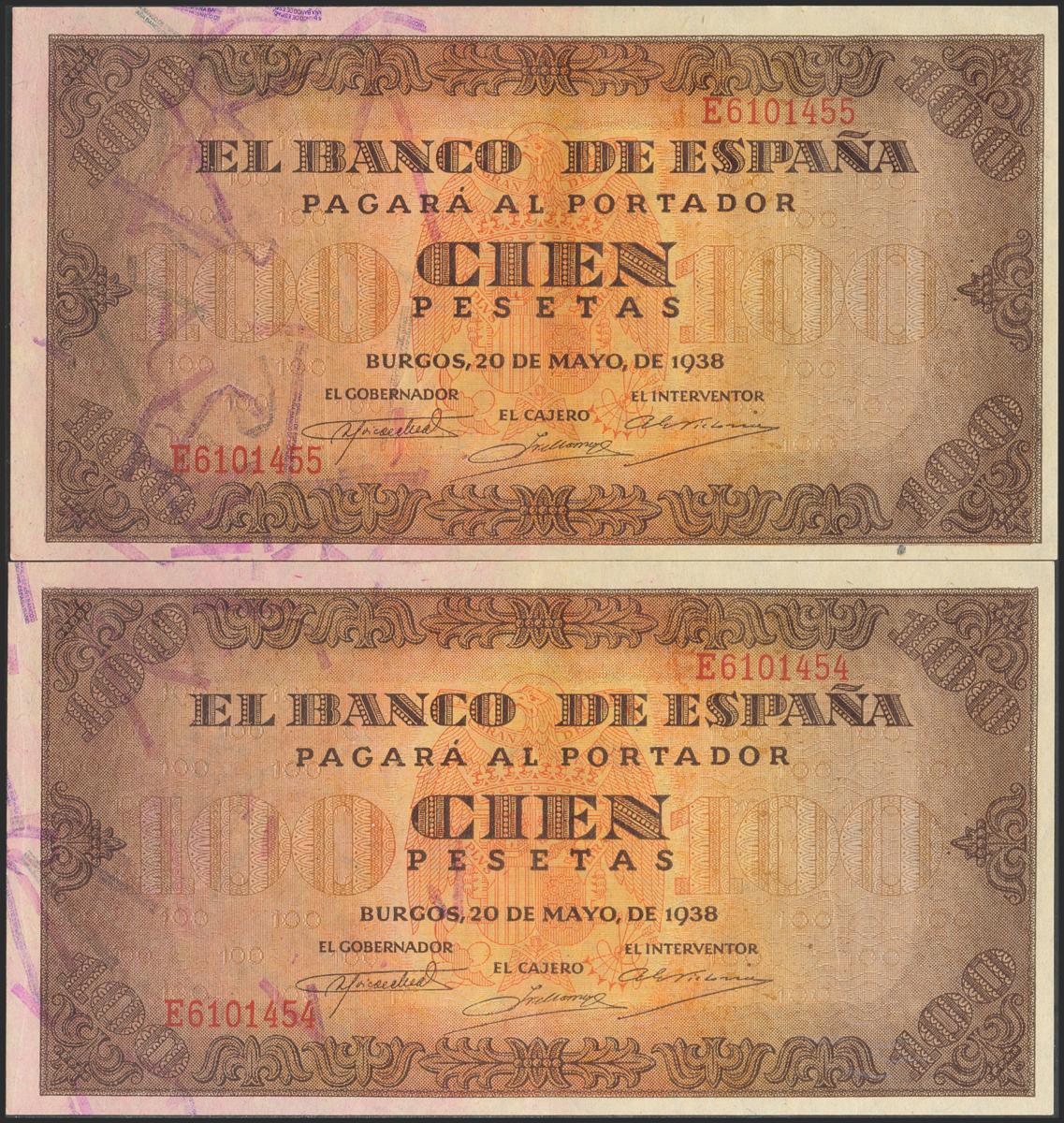 100 pesetas. May 20, 1938. Correlative couple. Series E. (Edifil 2021: 432a). Retains much of the original size. Good Extremely Fine.