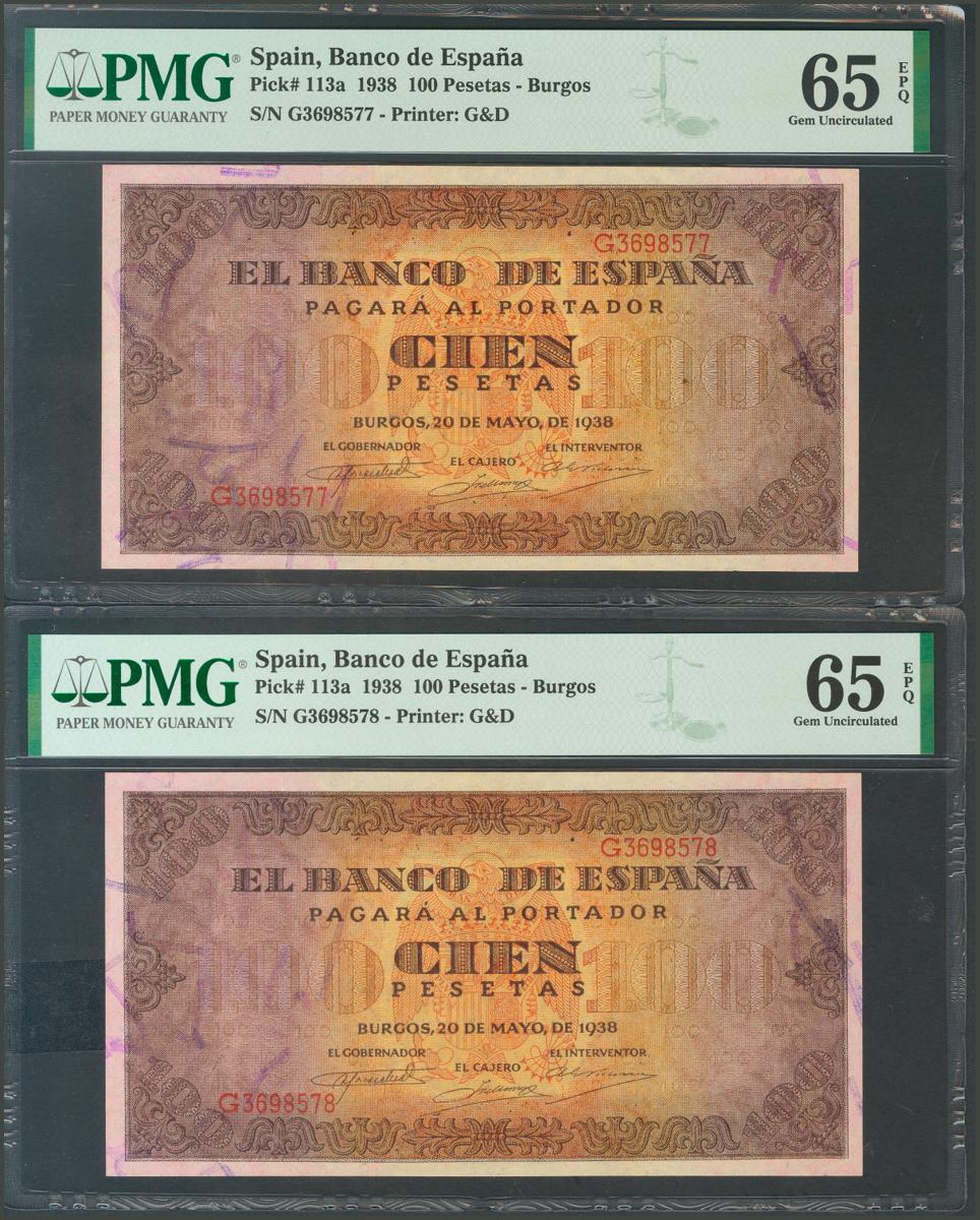 100 pesetas. May 20, 1938. Correlative couple. Series G. (Edifil 2017: 432a). Original sizing. Uncirculated. PMGEPQ65 packages, both.
