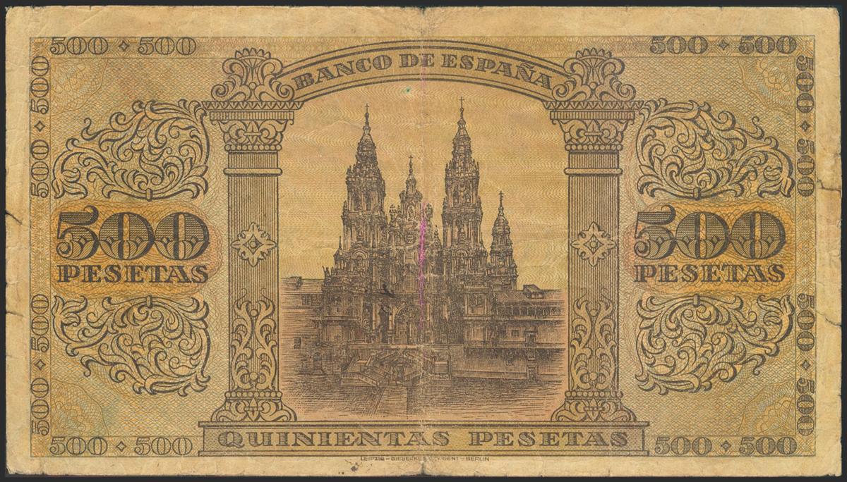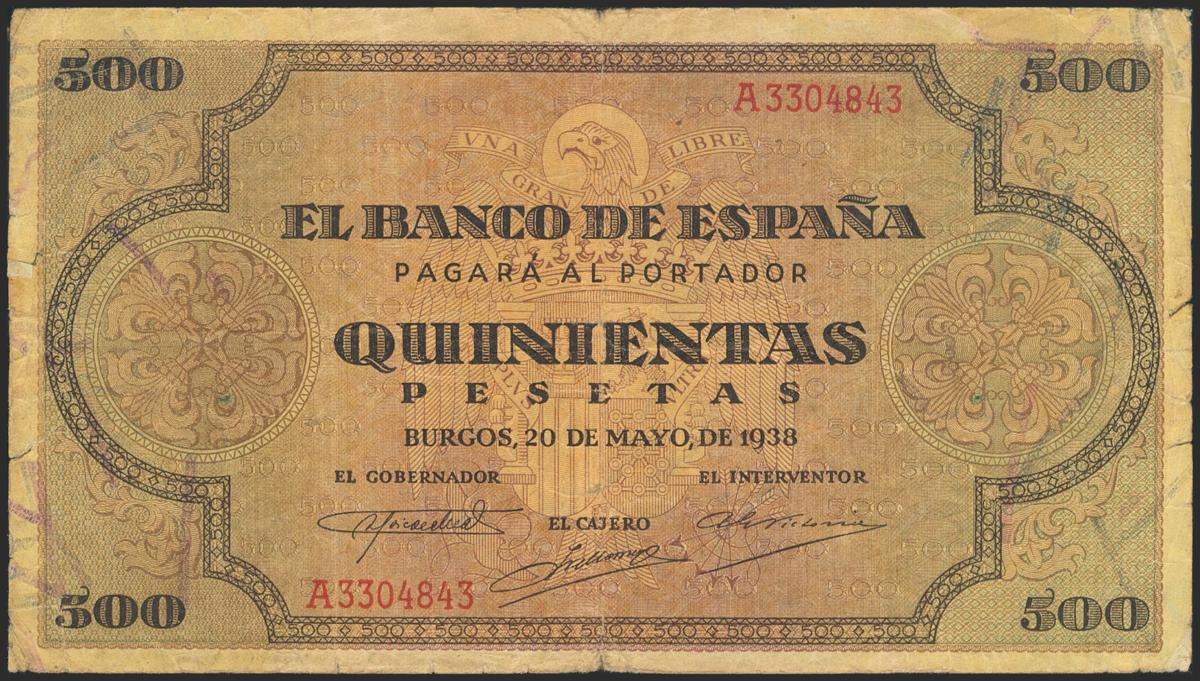 English 500 pesetas. May 20, 1938. Series A. (Pick: 114a, Edifil: 433). Some cuts with an attempt to repair and remains of adhesive. Fine.