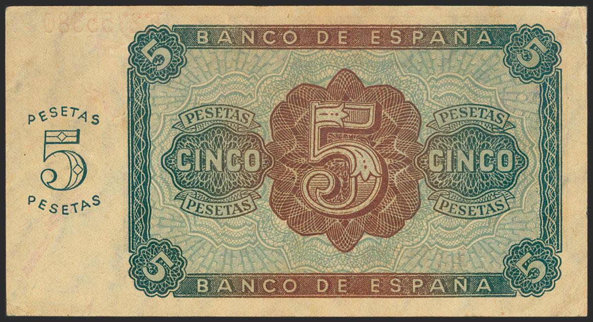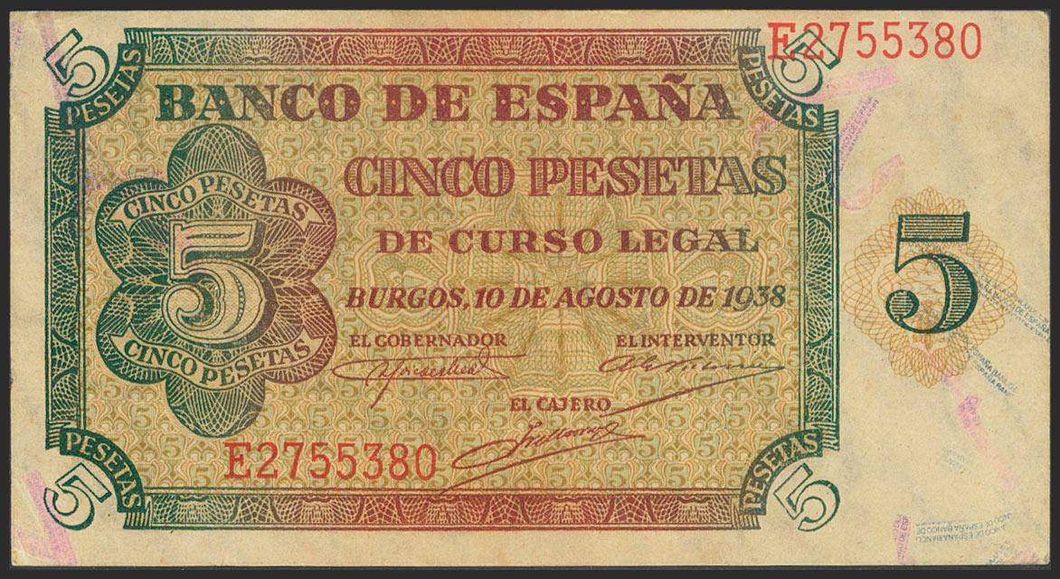 5 Pesetas. August 10, 1938. Series E. (Edifil 2021: 435a). It keeps all its original size. Almost Uncirculated-.