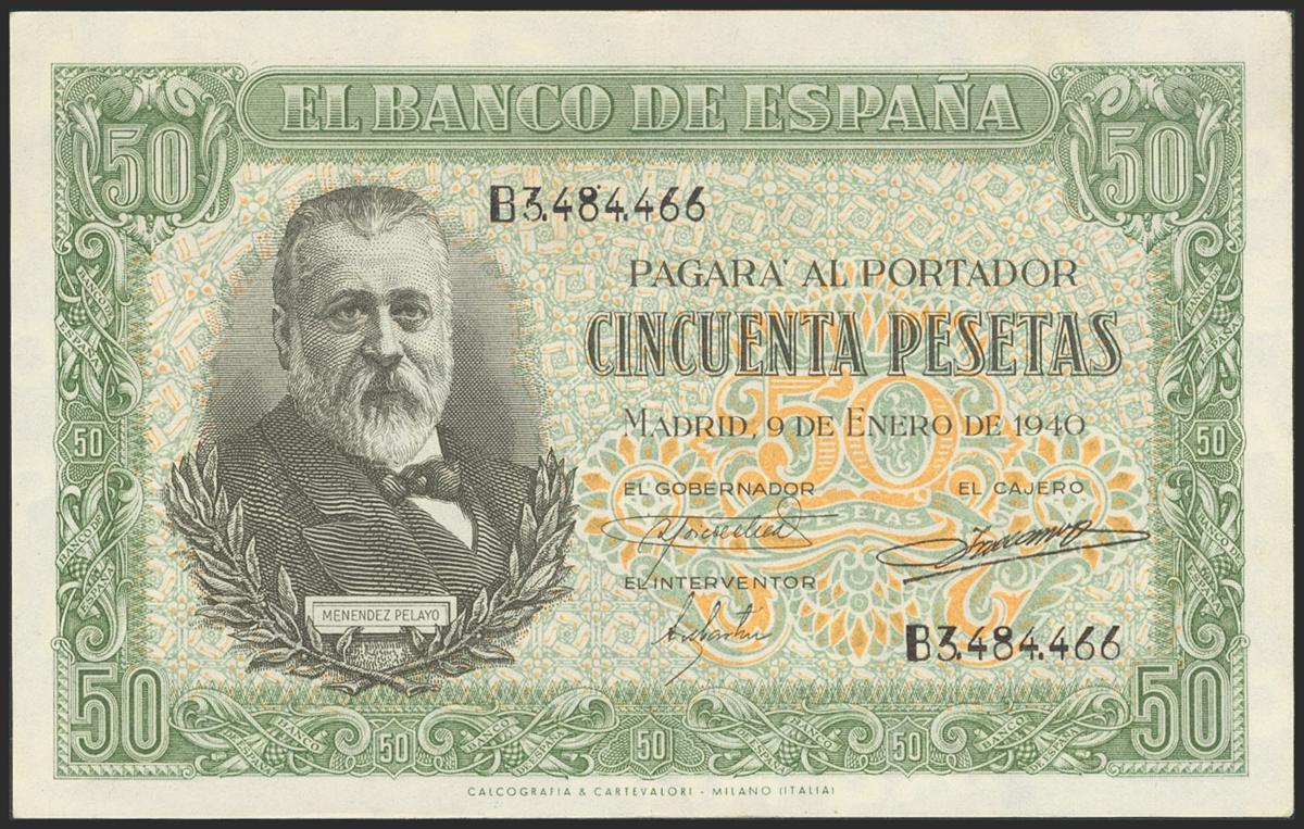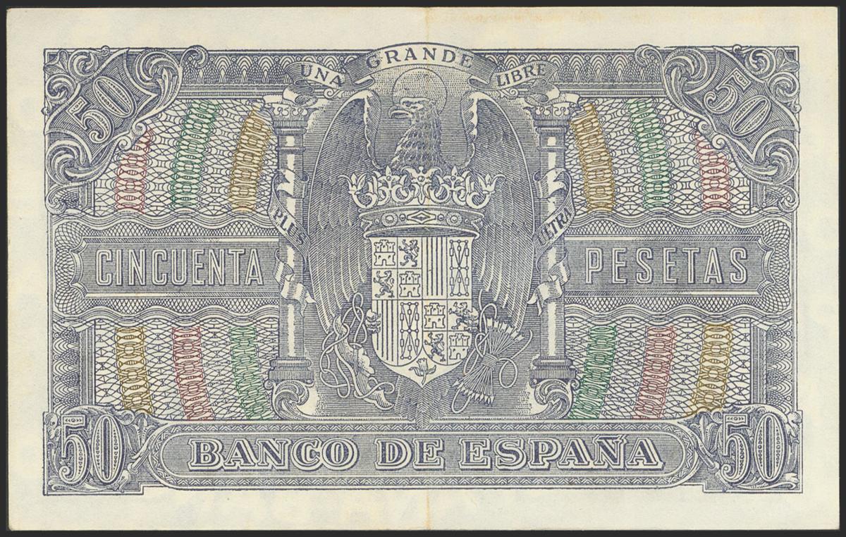 50 Pesetas. January 9, 1940. Series B. (Edifil 2021: 437a). It retains part of the original size. Extremely Fine.