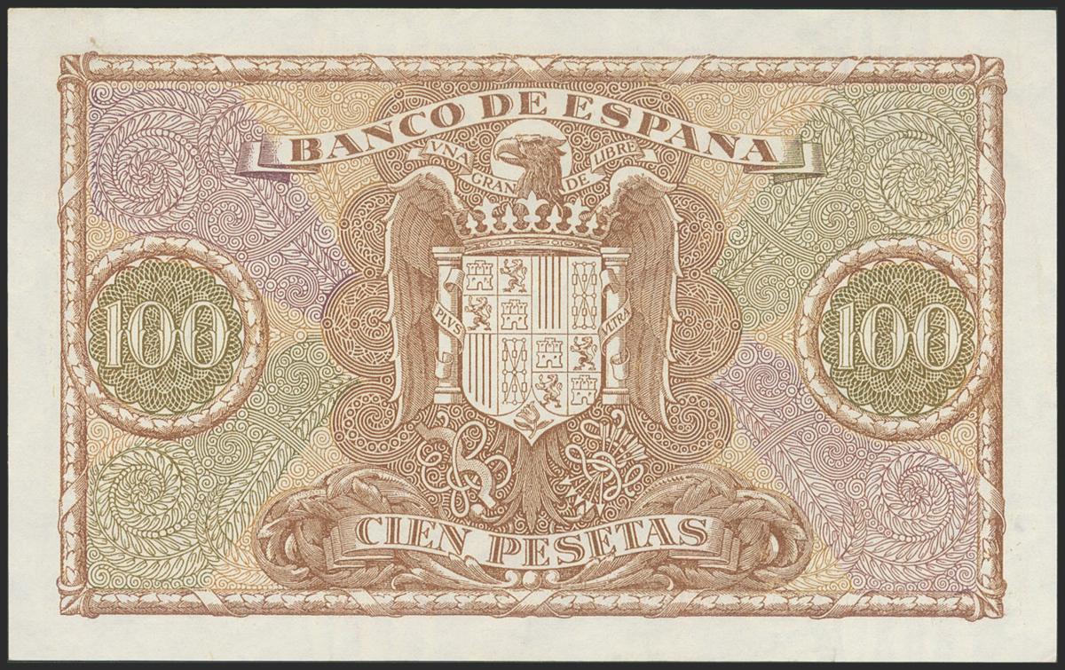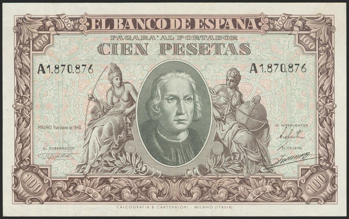 100 pesetas. January 9, 1940. Series A. (Edifil 2017: 438). Original sizing, minimal mark on the bottom margin. Good Extremely Fine.